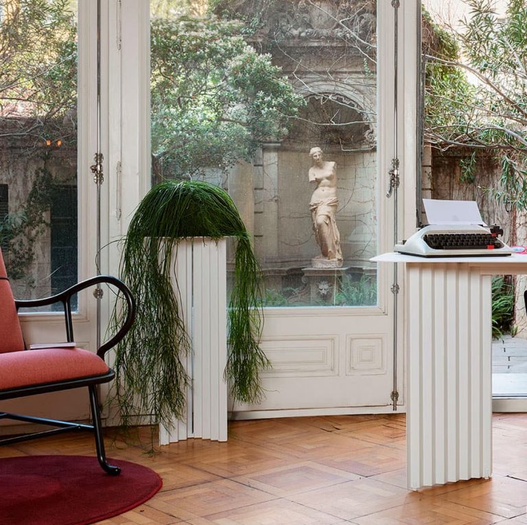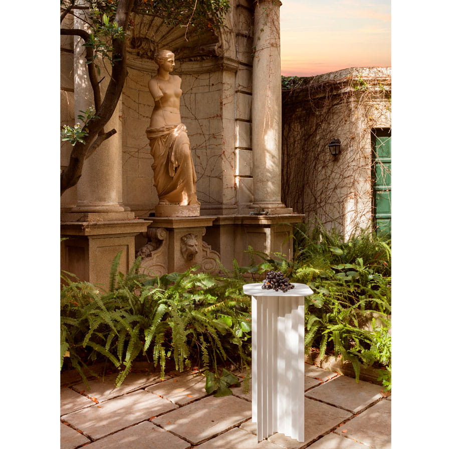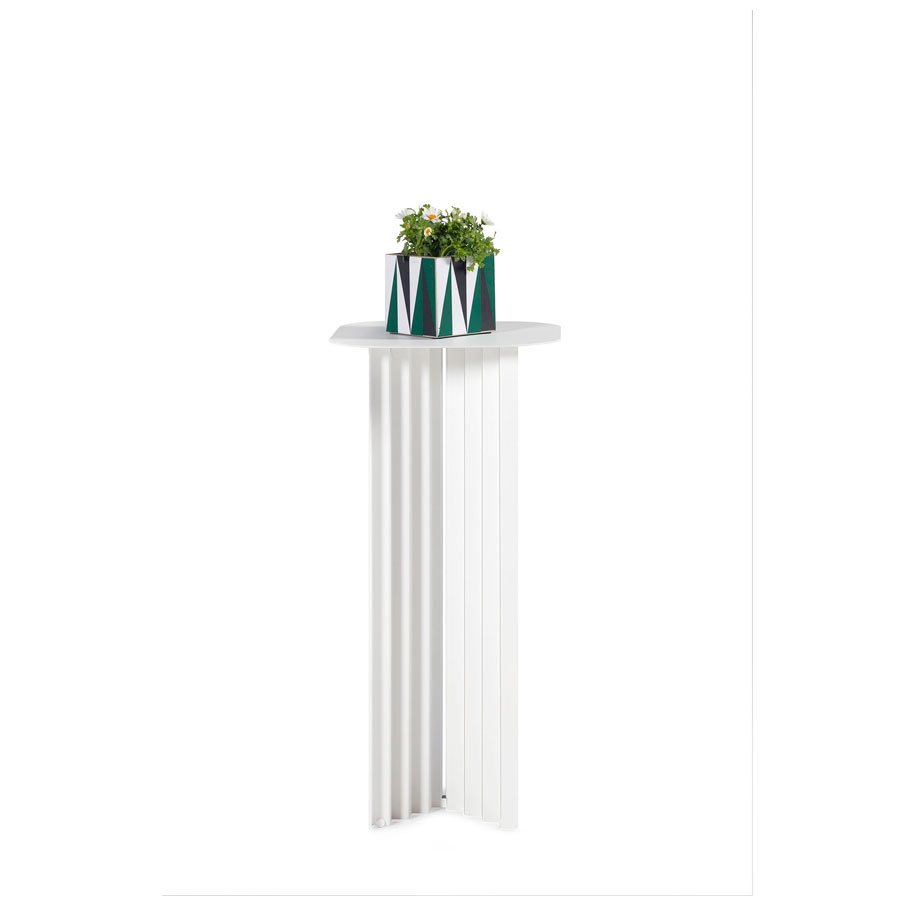 The Plec pedestal fits stylishly into any setting and space, whether in a corner of the living room, by the door in a reception or waiting room, or in your garden surrounded by plants and flowers. Because the Plec table is also suitable for outdoor use thanks to the cataphoretic coating process applied to the steel.