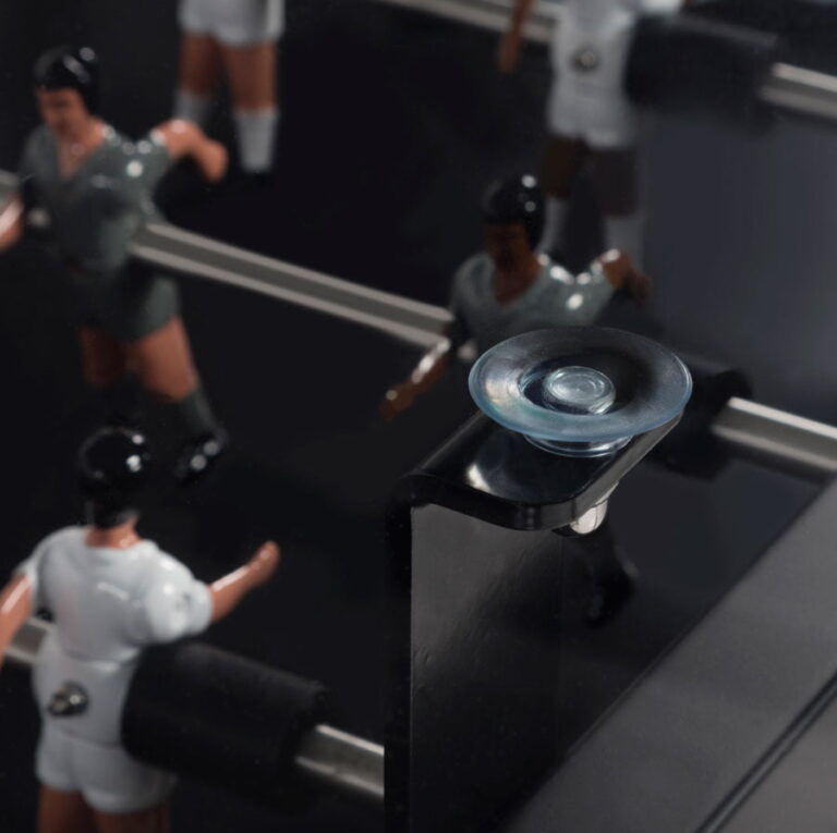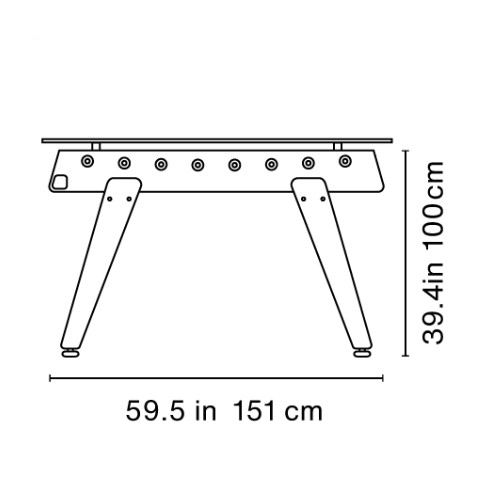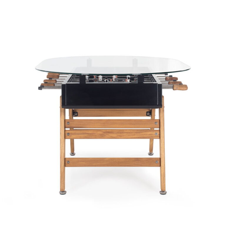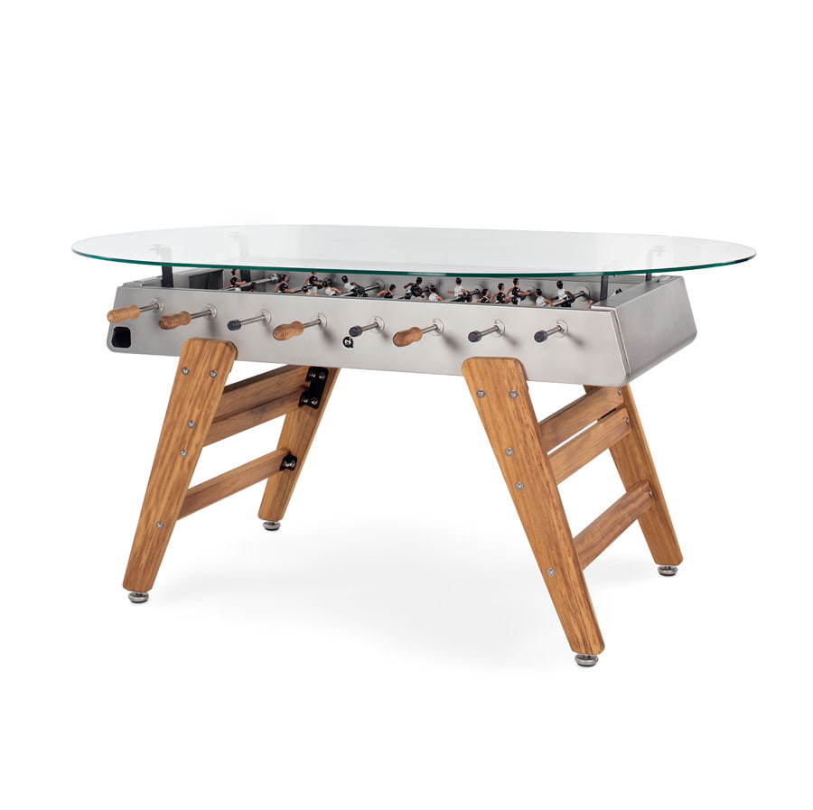 It was only natural that the RS3 Wood Dining table would have its moment. This is the dining table version of our RS3 Wood, a football table fitted with wooden legs. Without altering its essence and playful spirit, we’ve added functionality to this model. Now it’s not just a football table; it’s a football-dining table with a glass top. To play between dishes, or to eat between scoring goals.