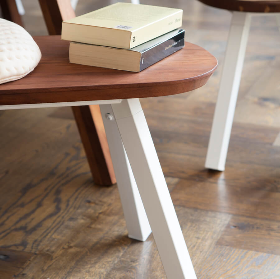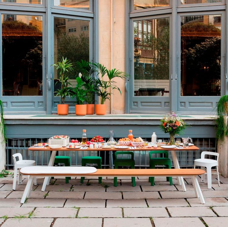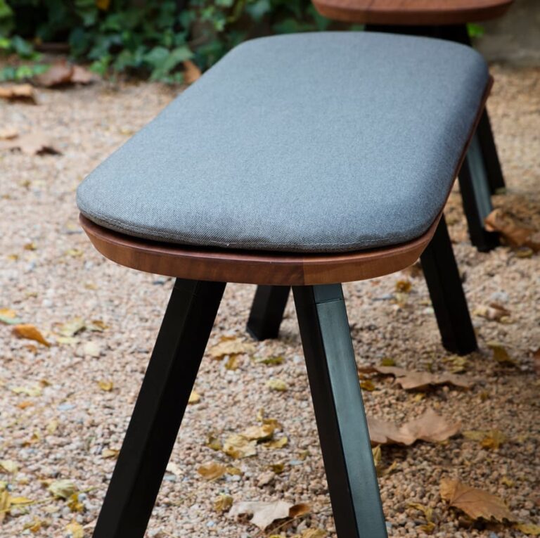 All the sizes are suitable for both outdoor and indoor use, with seats that come in hardwearing iroko wood – recommended for tables with HLP and walnut wood tops – or in warm oak wood for interiors.