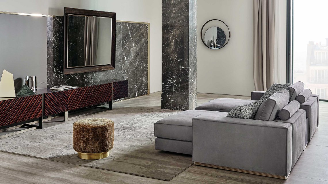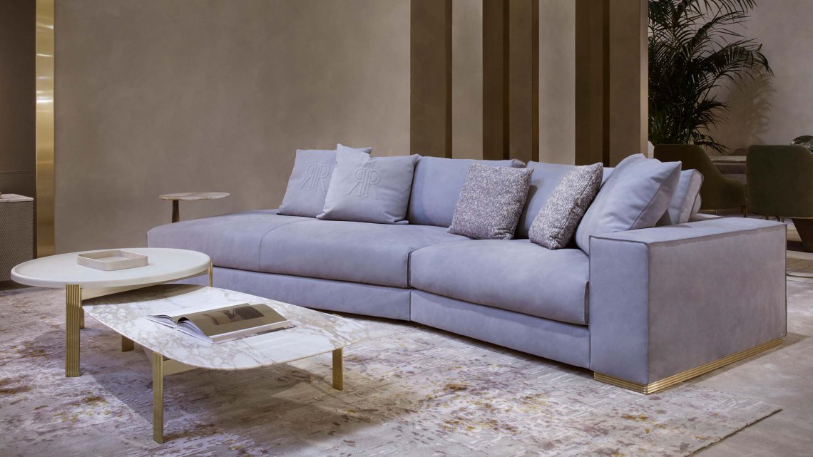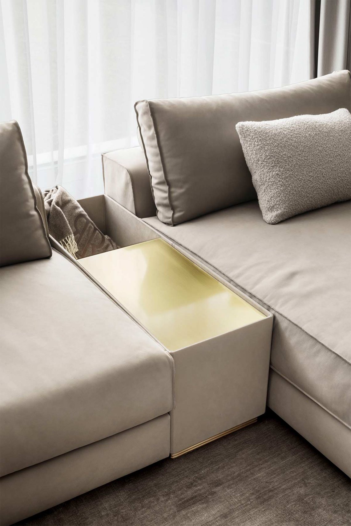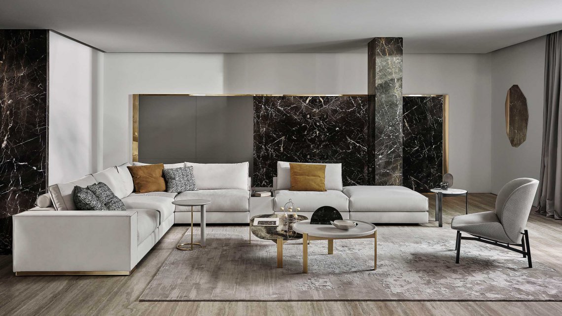 模塊化沙發(fā)系列以書架扶手、擱板靠背和邊桌單元為特色。還采用生切皮革。
