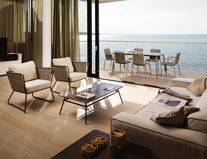 Pouf in alluminio verniciato a polveri, intrecciato con Round Searope. Pratico e dal gusto finemente classico, perfetto per accompagnare la poltrona coordinata. Adatto per interno e per esterno, sia in contesti residenziali che contract.