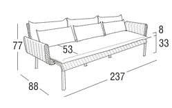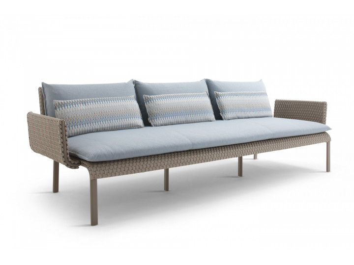 Divano in acciaio 304 verniciato a polveri, intrecciato con Flat Trendyrope. Un divano accogliente, dove la particolare geometria dello schienale si coniuga perfettamente al desiderio di comfort, creando un angolo per vivere momenti di relax. Ottimo per arredare terrazzi e patio, dona forte personalità anche alle zone living interne. Ideale per arredamenti residenziali e contract.