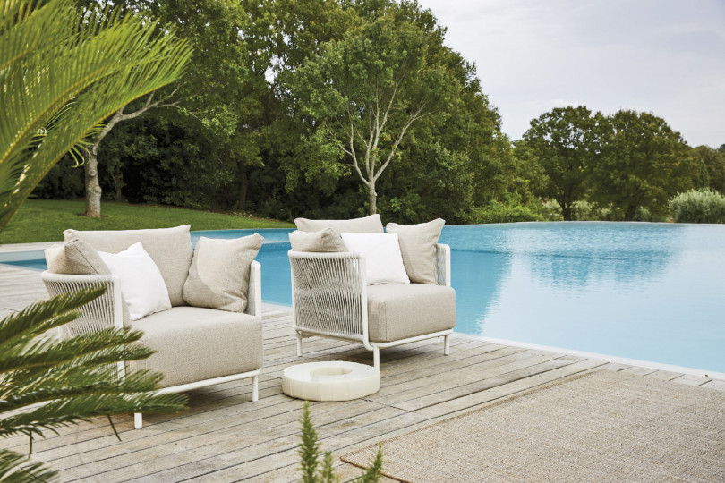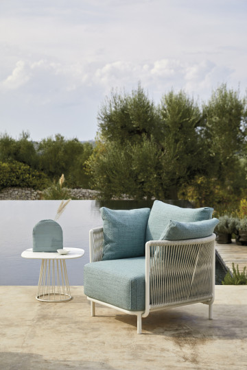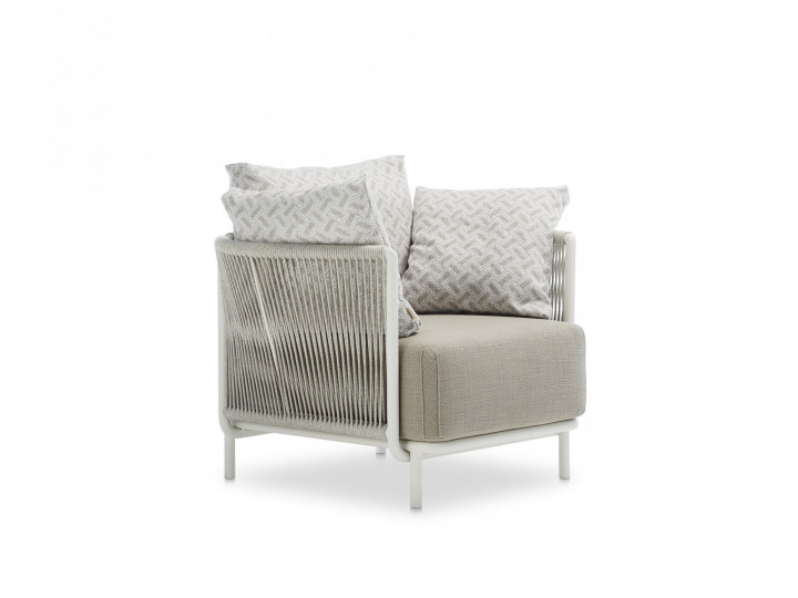 Sedia con braccioli in alluminio con trattamento a polveri, intrecciata con sunrope. L'essenzialità delle forme viene arricchita dal bracciolo finemente lavorato, gli intrecci in sunrope, invece, le conferiscono forza e resistenza. Ideale per l’arredamento contract è pratica da gestire in quanto può essere facilmente impilata. Sedia per esterno, perfetta per ristoranti.