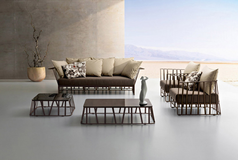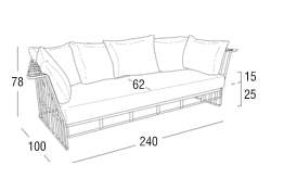 Divano in acciaio 304 verniciato a polveri, intrecciato con Flat Trendyrope. Un divano accogliente, dove la particolare geometria dello schienale si coniuga perfettamente al desiderio di comfort, creando un angolo per vivere momenti di relax. Ottimo per arredare terrazzi e patio, dona forte personalità anche alle zone living interne. Ideale per arredamenti residenziali e contract.