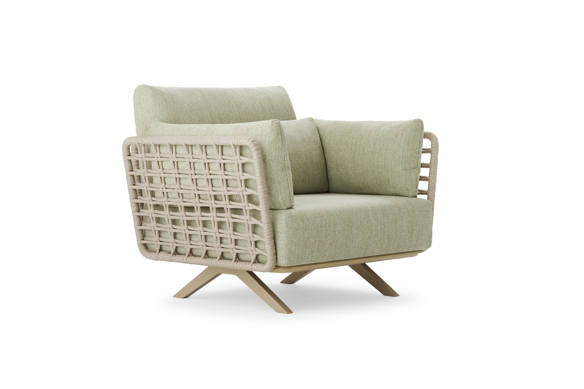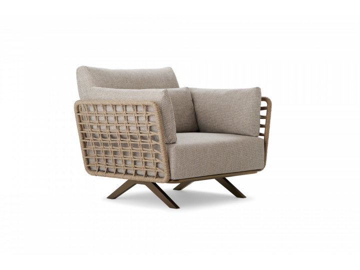 Poltrona in acciaio inox Aisi 304 ed alluminio, verniciata a polveri ed intrecciata in Oval Trendyrope. Linee che valorizzano l'iconico stile italiano, dove le lavorazioni in corda donano un'estetica materica ed artigianale alla morbidezza avvolgente delle sedute, per concepire uno spazio ideale, dedicato al relax e alla socializzazione. Progettata sia per l'arredamento residenziale che contract, outdoor e indoor.