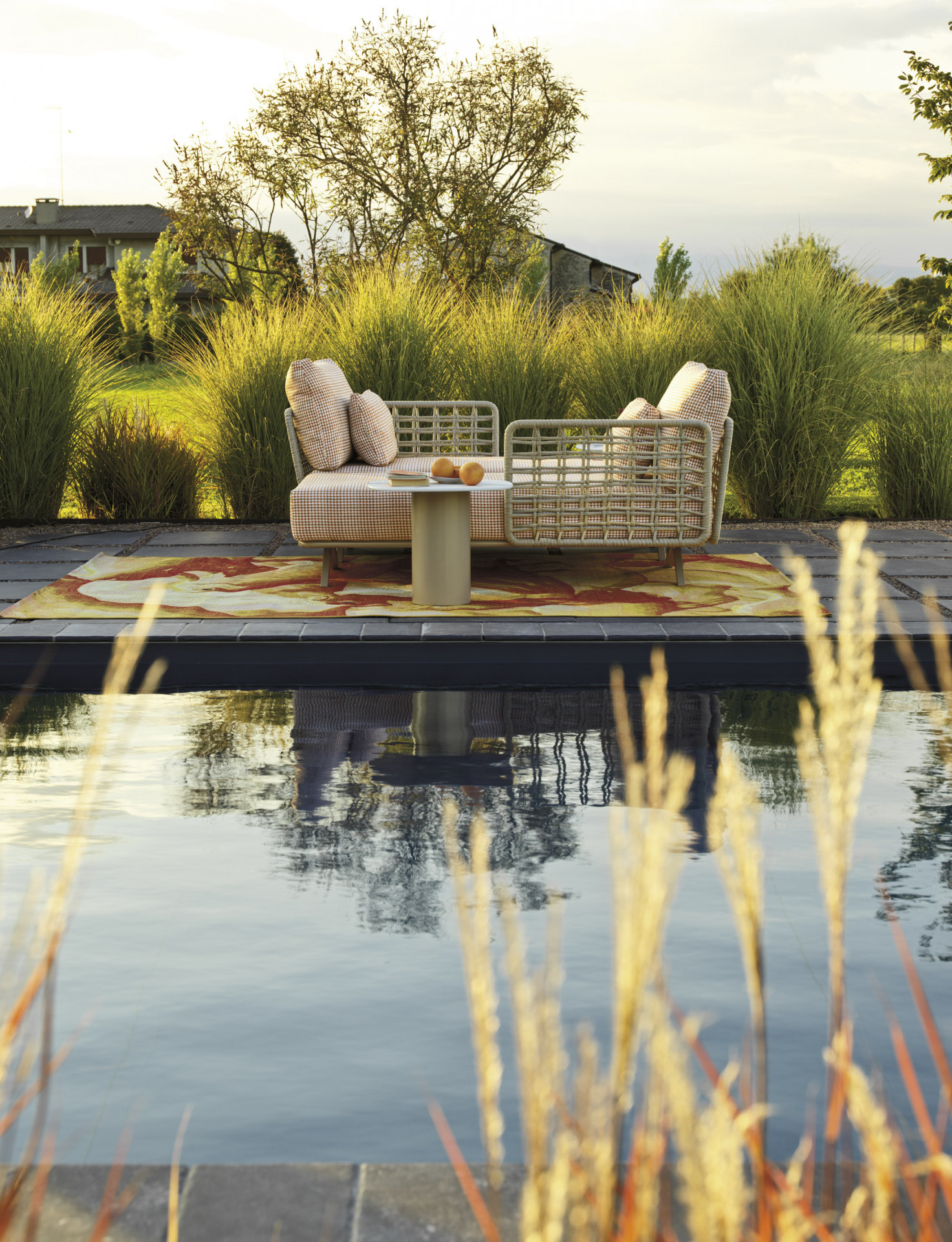 Chaise longue  in acciaio inox Aisi 304 ed alluminio, verniciata a polveri ed intrecciata in Oval Trendyrope. Linee che valorizzano l'iconico stile italiano, dove le lavorazioni in corda donano un'estetica materica ed artigianale alla morbidezza avvolgente delle sedute, per concepire uno spazio ideale, dedicato al relax e alla socializzazione. Progettata sia per l'arredamento residenziale che contract, outdoor e indoor.