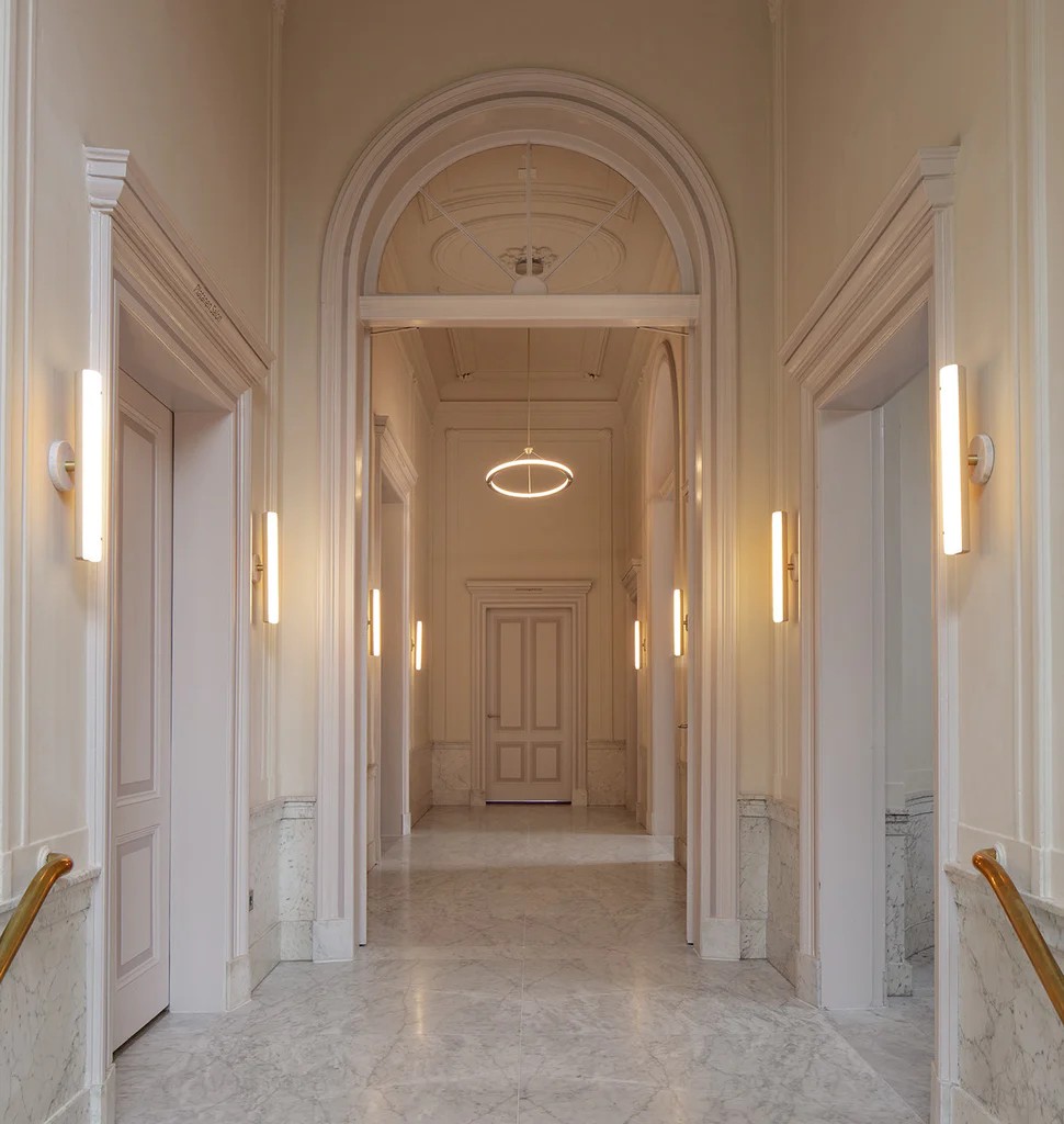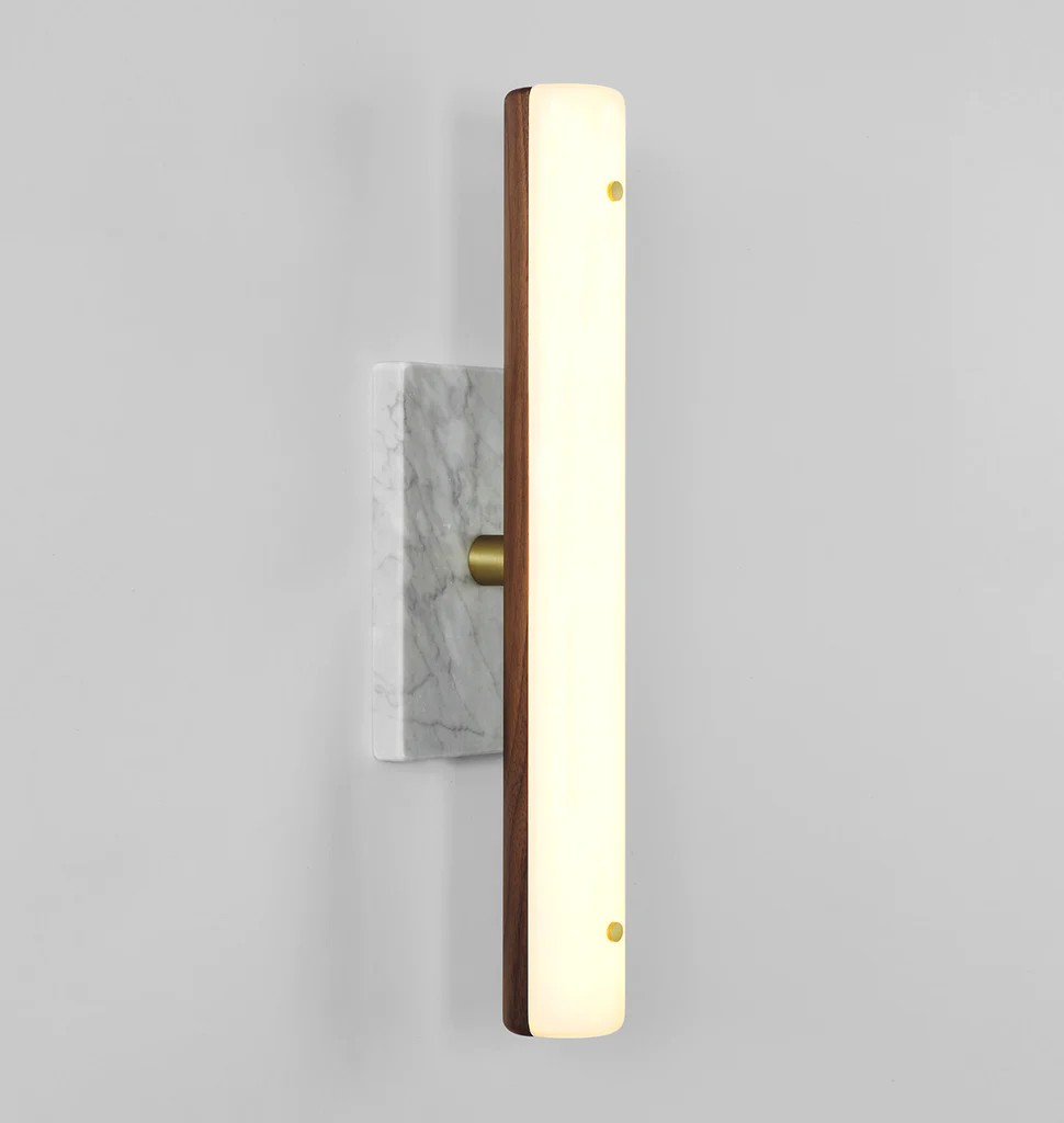 Counterweight is a series of LED fixtures made of gently arching, steam-bent wood that uses marble and brass as ballasts. Whether acting to counterbalance the lamp of the pendant light, or fixed as the base of the sconce, the mass of the stone and metal acts as a foil to the otherwise lightweight frames.