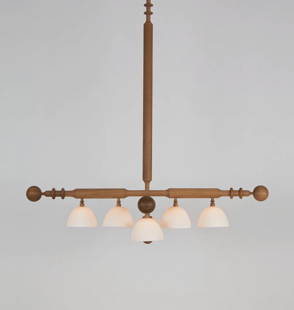 Helgerson's Del Playa is composed of turned wood stems and ceramic shades that recall her childhood on the beaches of Santa Barbara. The materials in this line feel very much of that time and place – the handcrafted aesthetic of California in the 70s.
