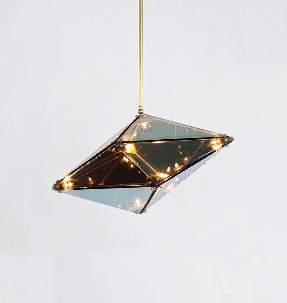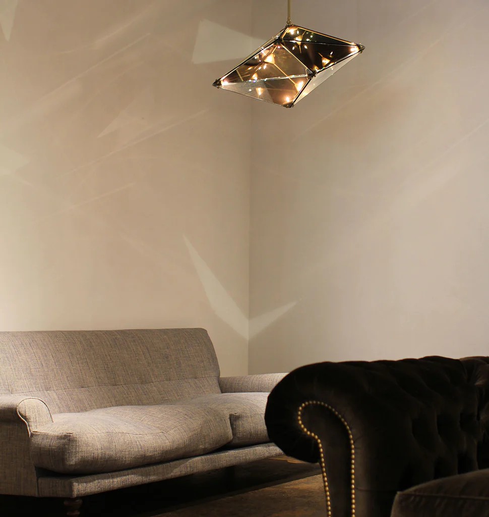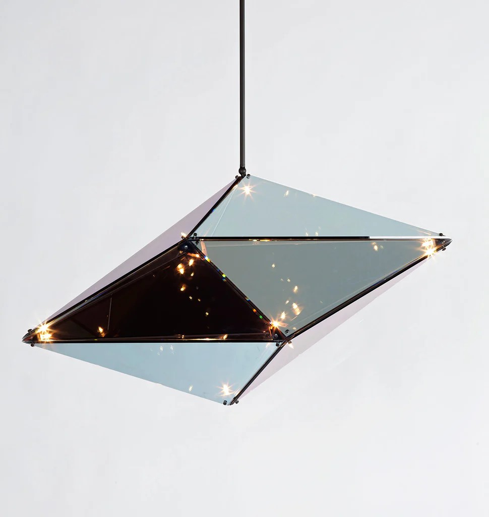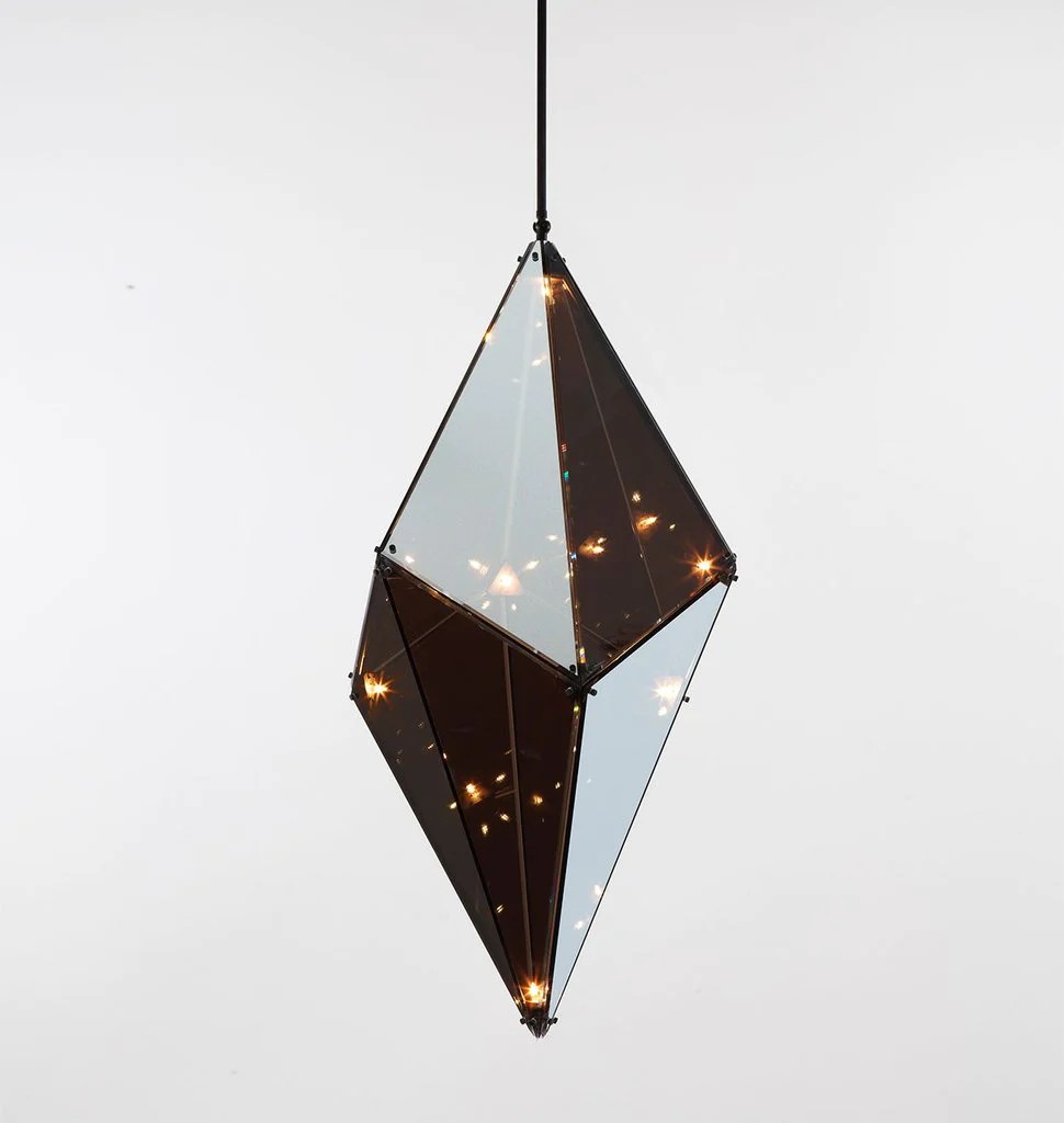 Bec Brittain's Maxhedron is a study in material transformation through light and reflection. When off, the partly-translucent Maxhedron reflects and blends with its environment; when on, the dazzling inner constellation of bulbs projects bands of light onto nearby surfaces.