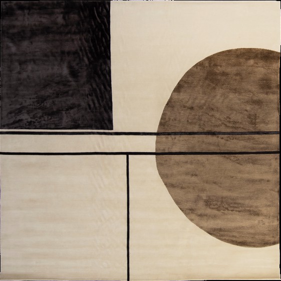 It features geometrical shapes - a semi-circle and lines splitting the rug into uneven asymmetrical sections in classic colours making it a unique and distinctive piece. This elegant rug is handknotted without any child labour in: