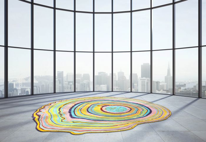 Agata Rose Laguna is one of the exclusive limited edition colourful rugs part of Sahrai's Artists Selection designed in collaboration with David Elia and inspired by the mythical Brazilian Agate stone known for its uniqueness - no two Agate stones are the same. This design features spirals of vivid colours stemming from an epi-center with pink as the dominating colour and covering the entire surface of the rug.
