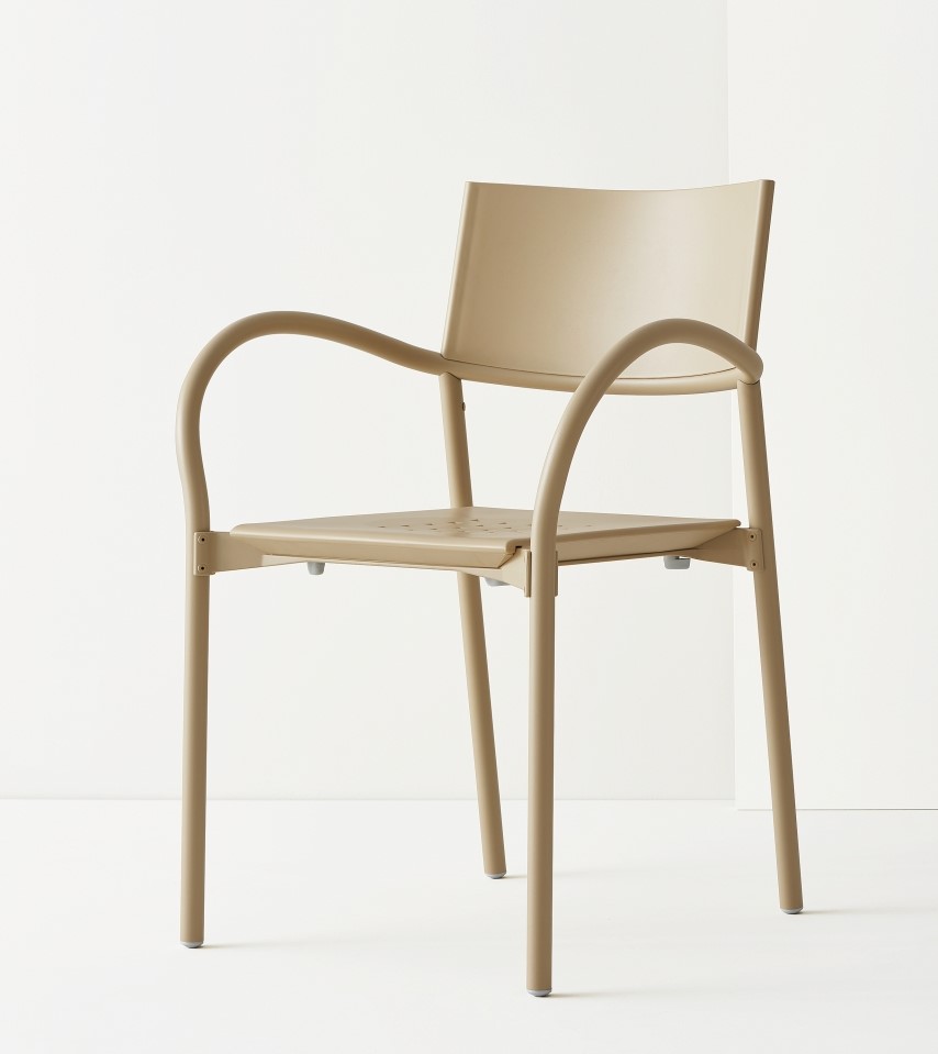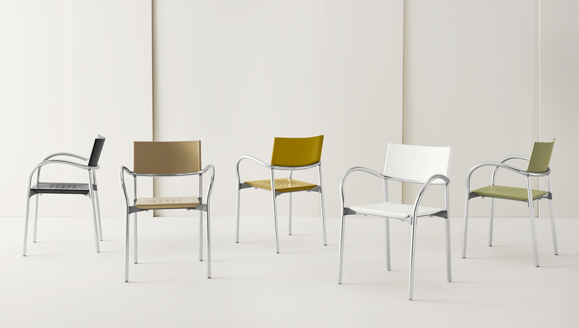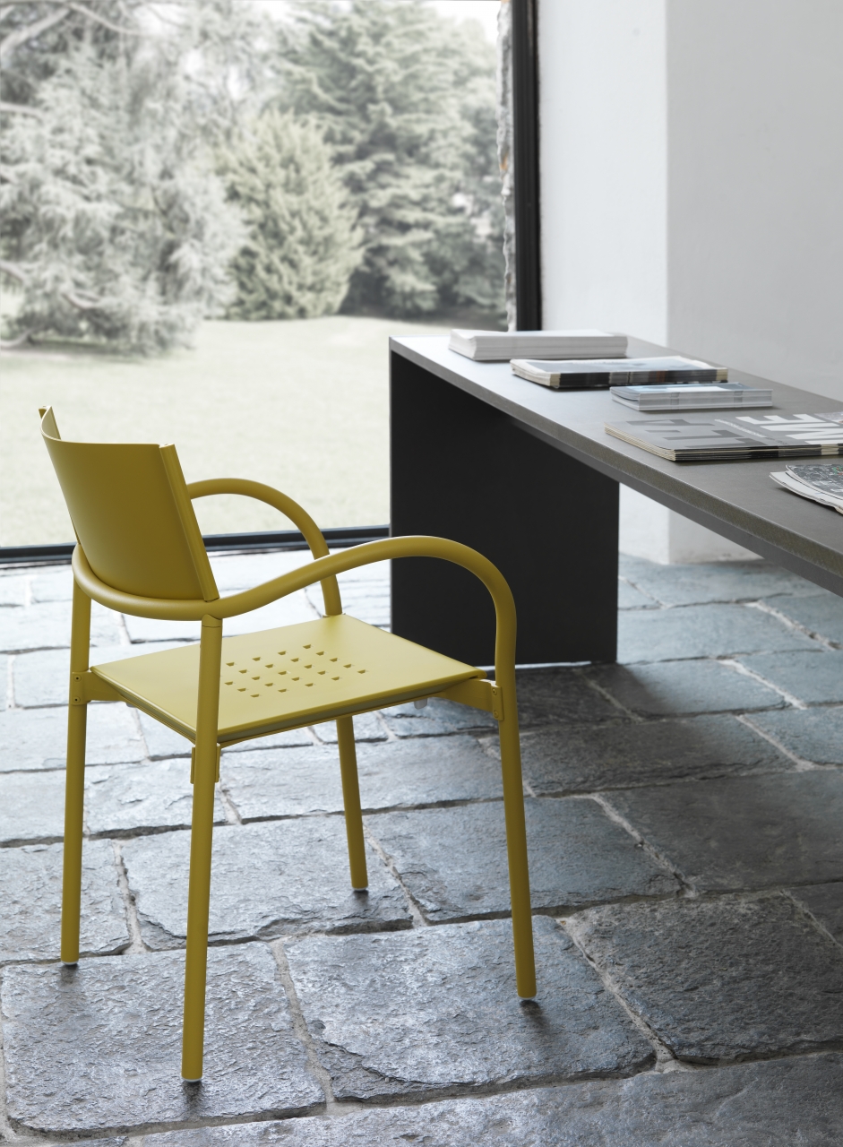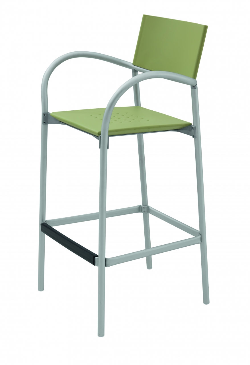 Award winning stacking chair with the simplicity of form and function essential for any environment. Aluminum, anodized or powder coated; seat and back in recyclable polypropylene. The chair and stool are perfect for indoor or outdoor.