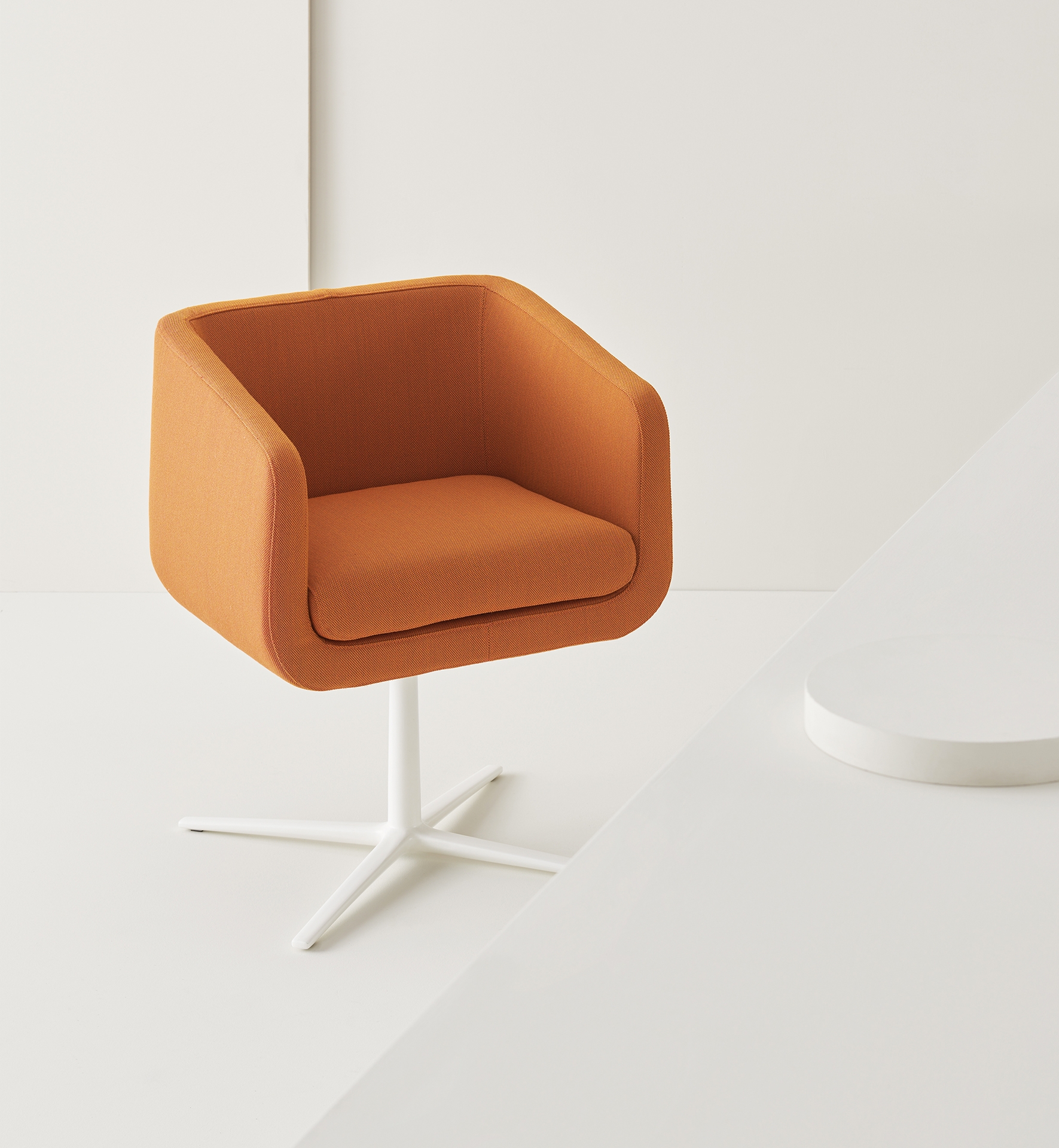 Swivel armchair for comfort at 360 degrees. Enveloping silhouette and soft materials give shape to a pleasant seating in every environment from working to relaxing. Covers available in several materials; four-star base in die cast aluminum with powder coated or polished brushed finish.