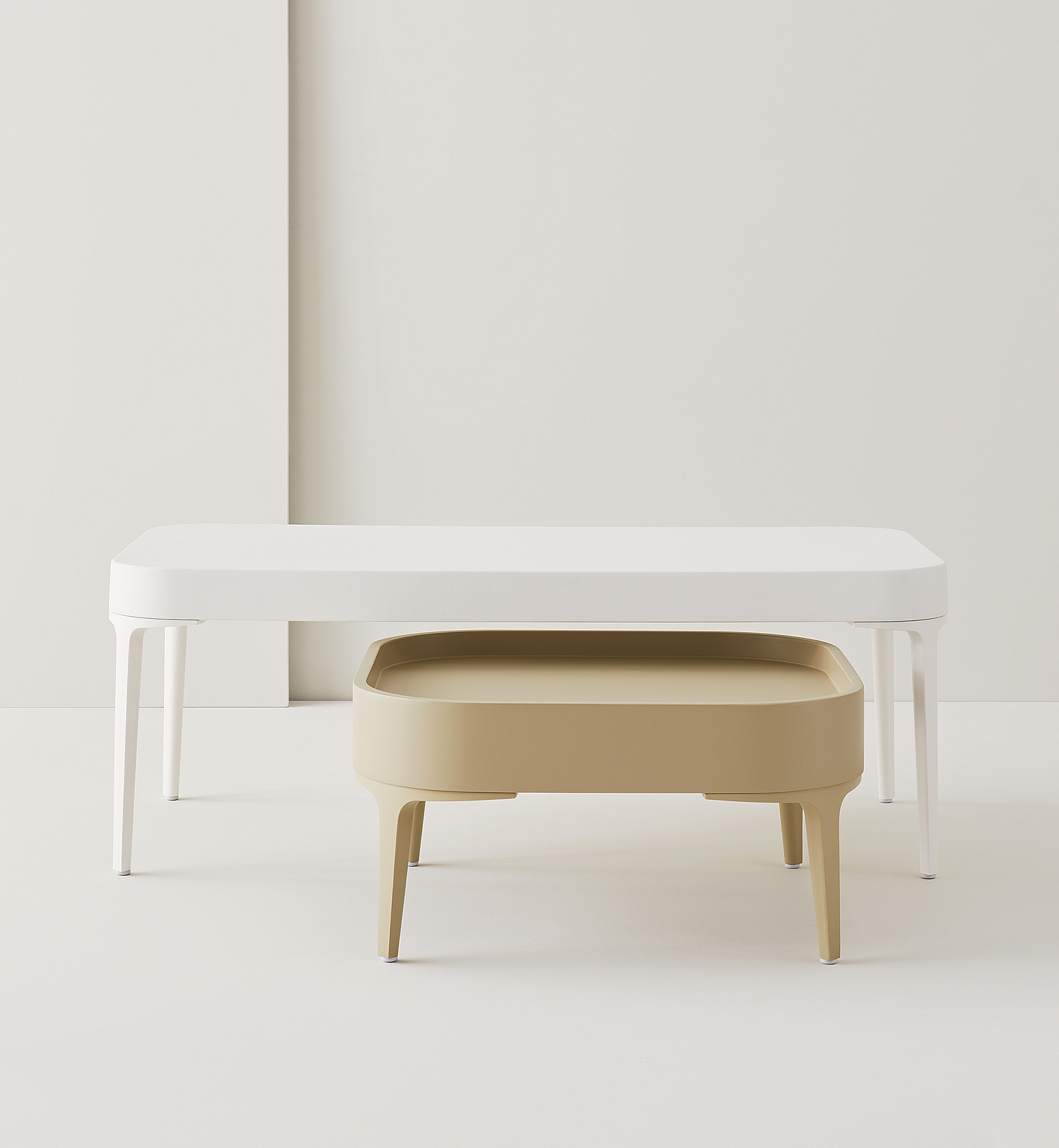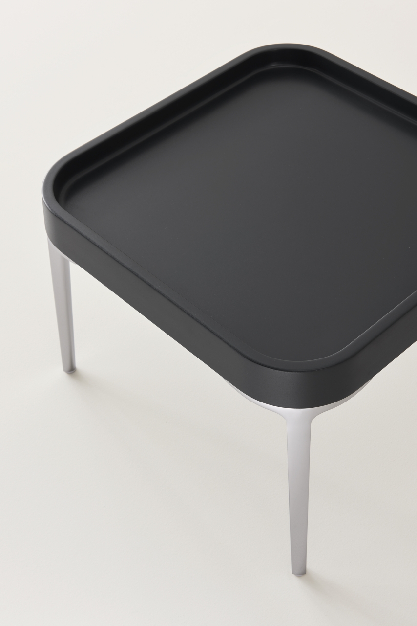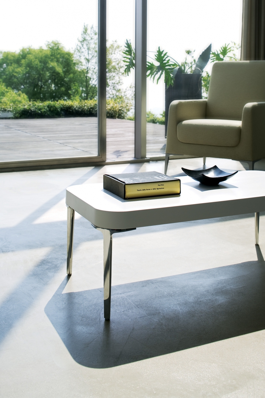 Alphatables, a series of multipurpose low tables with essential and soft lines. Thin die cast aluminum legs, in powder coat or chrome finish, combined with polyurethane tops with or without lip. Three dimensions and three colours that enhance their shape.