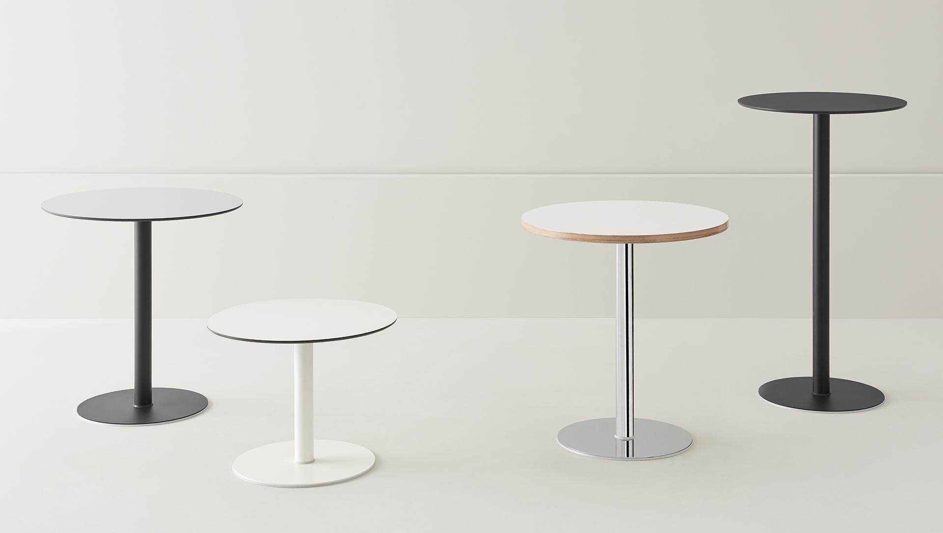 Boom Collection brings together in a single series the iconic tables in their round, square and rectangular versions. Base, column and top can be round or square and combine with each other without constraints. Tops are available in various materials and sizes; bases and columns in high-strength steel may be in powder coat, chrome, or brushed stainless. The height can be fixed or adjustable with gas lift. Essential and extremely functional, Boom is perfect for both performing and comfortable spaces.
