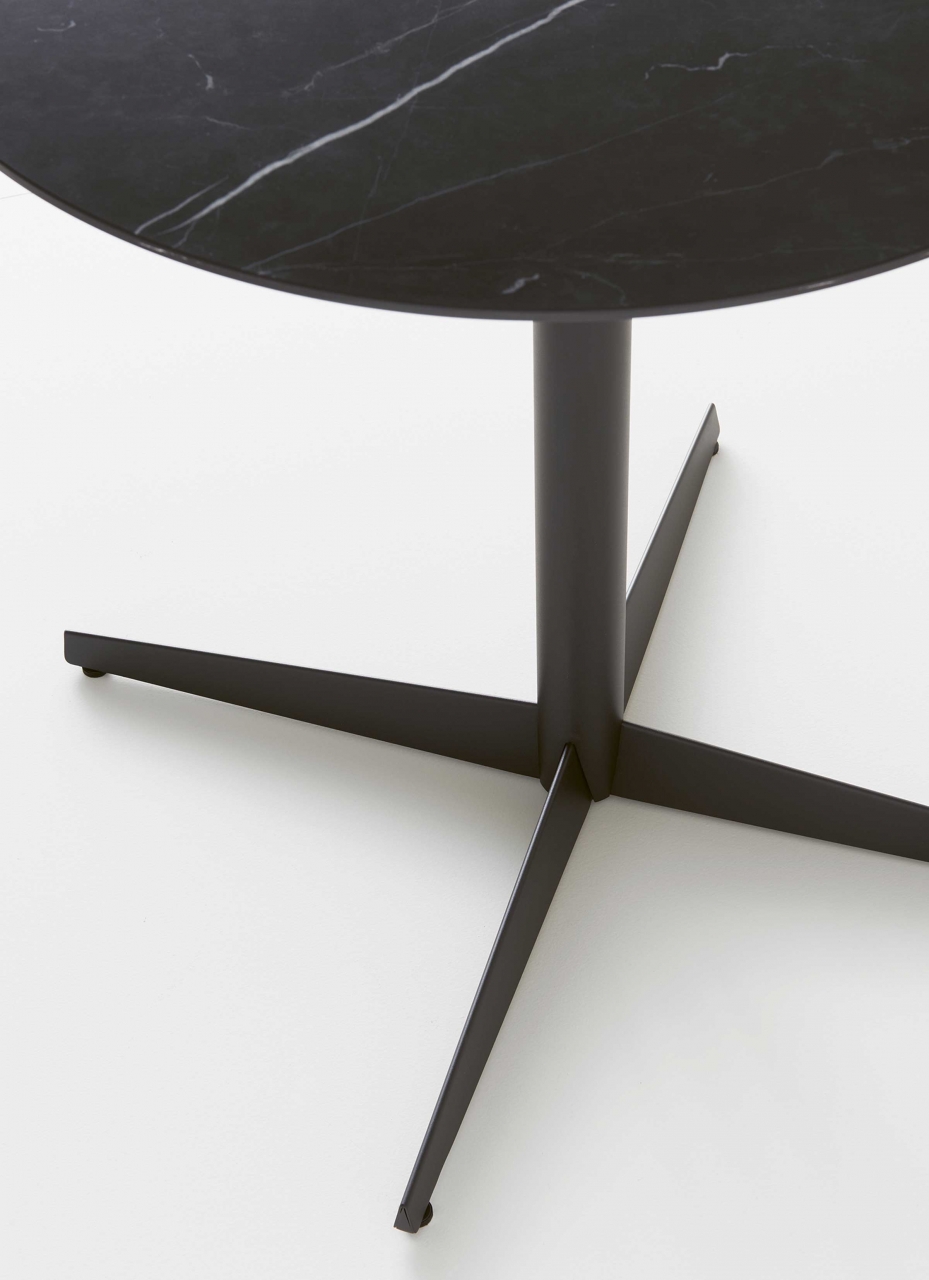 System of tables and low tables to meet all needs in the contract environment. Different models with either four-spoke or two-spoke bases can be combined with various tabletops. The linear design of the bases, available in three heights, are made in steel profile powder coated in the new black nickel and bronze finishes as well as in a range of various colours. Decorative ceramic tops in different finishes, laminate on plywood, or HPL provide endless style possibilities.