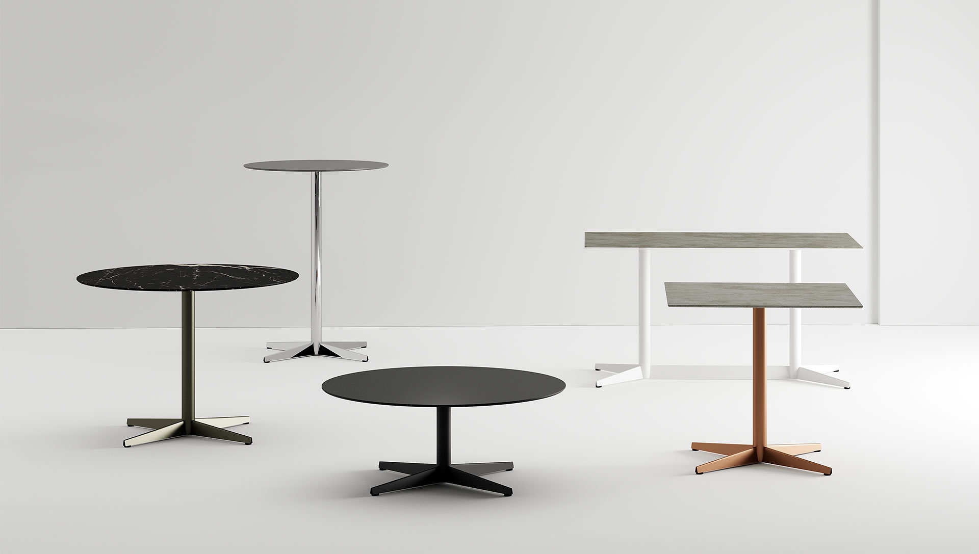 System of tables and low tables to meet all needs in the contract environment. Different models with either four-spoke or two-spoke bases can be combined with various tabletops. The linear design of the bases, available in three heights, are made in steel profile powder coated in the new black nickel and bronze finishes as well as in a range of various colours. Decorative ceramic tops in different finishes, laminate on plywood, or HPL provide endless style possibilities.