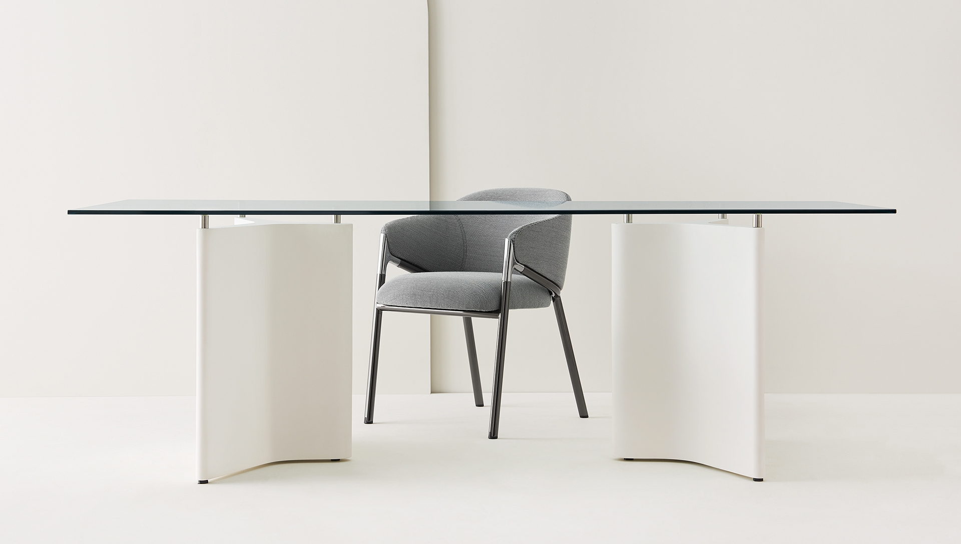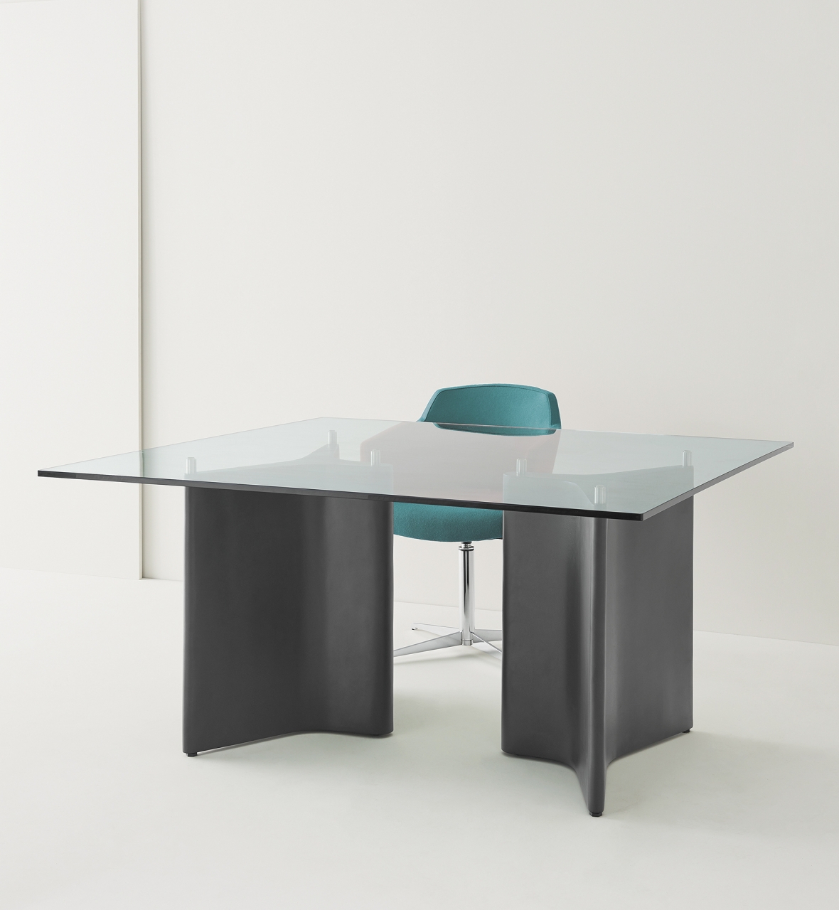 Tee is not a single table, but many tables at the same time. The self-supporting bases, combined with HPL laminate or glass tops, allow for considerable flexibility in composition. Original designs in varying sizes are perfect for dining, desking or conferencing tables.