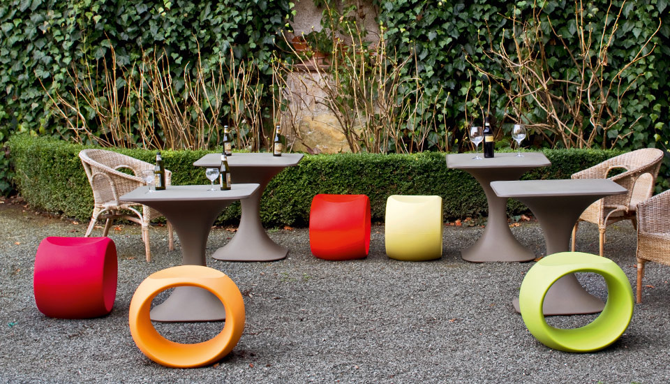Cero stools are informal seats made of polyethylene, characterized by lightness and defined by their open shape.