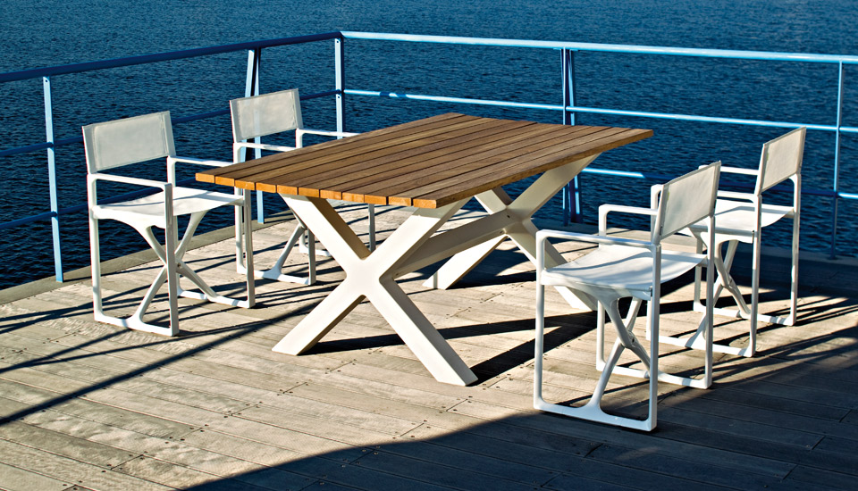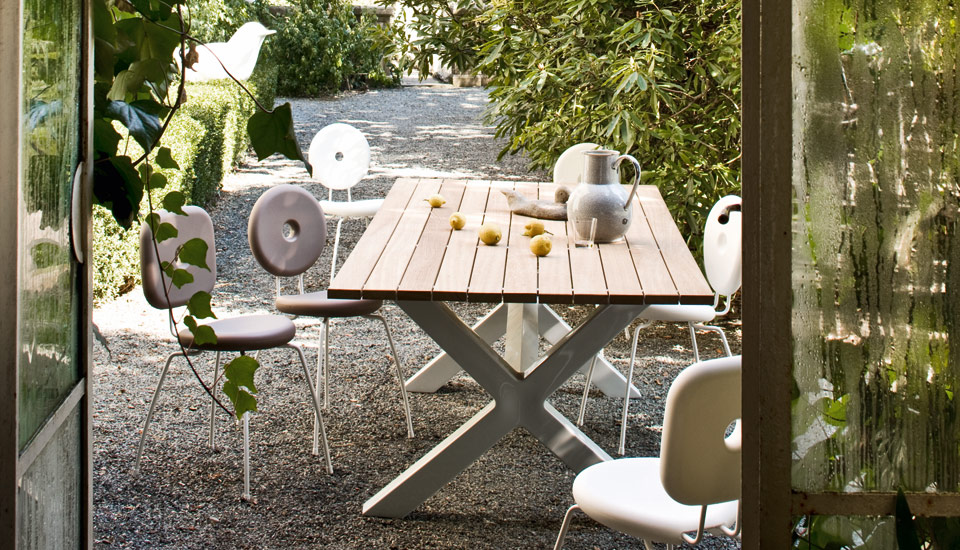 The table top of the outdoor tables is made from a new material that combines wood with plastic for outdoor use. The top is interchangeable and various options are available when choosing it: Serralunga offers materials with excellent aesthetic features and high durability, particularly against abrasions, bumps, scratches, stains and light.