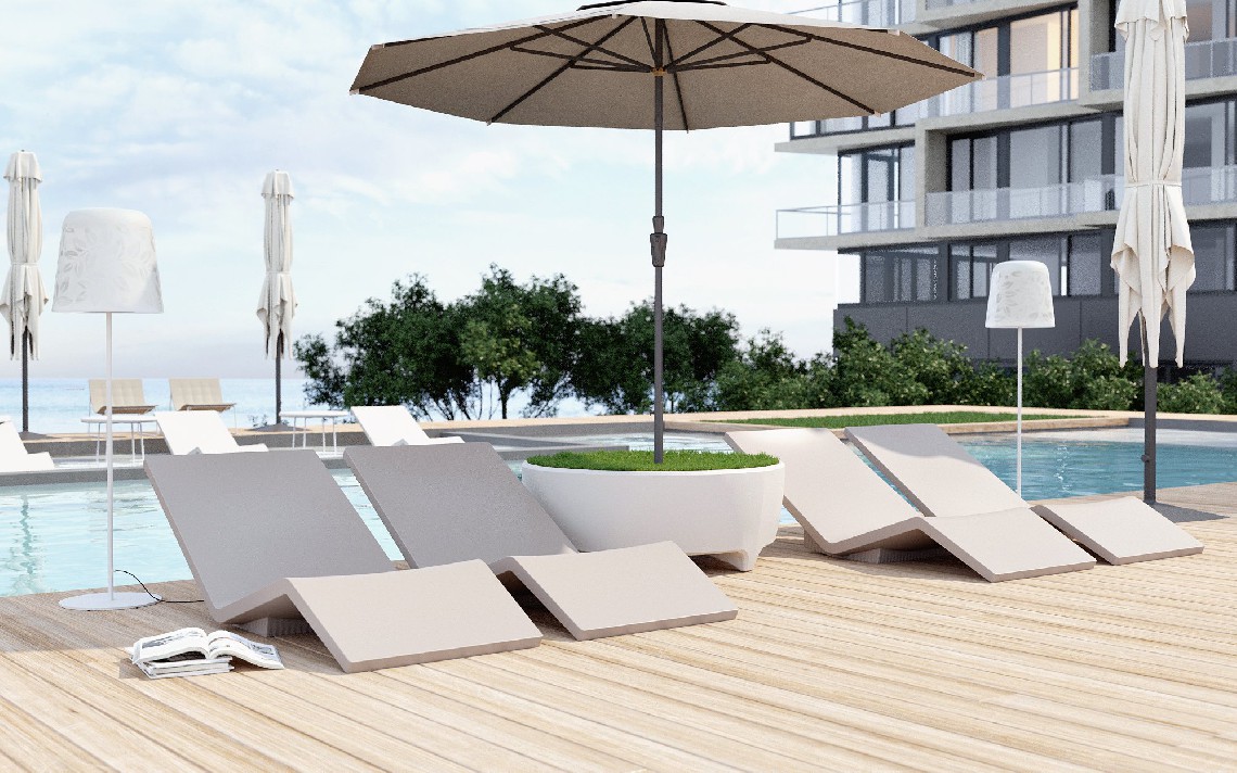 Rigorous profile and ergonomic solidity in perfect balance, it lives in a garden or in a relaxation area but above all in the swimming pool, where it fits with the elegance of a seashell on the shoreline.