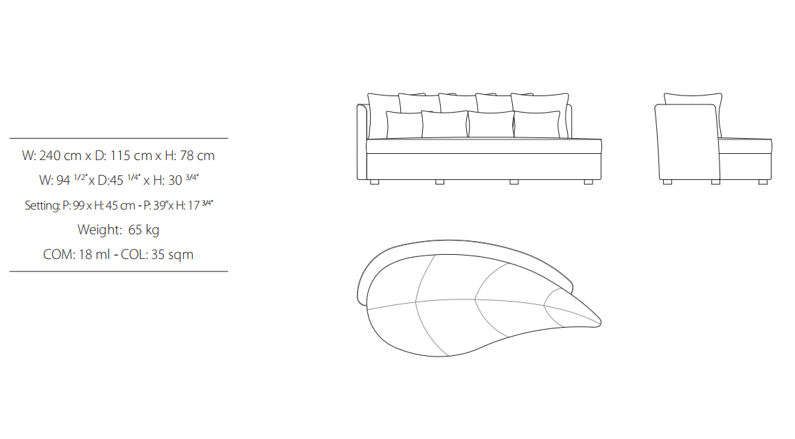 Sofa, frame made of solid timber and plywood. Variable densities polyurethane foam padding. Nr. 5 pillows 50x50 and nr. 4 dim. 40x40cm cm in mixed feather.