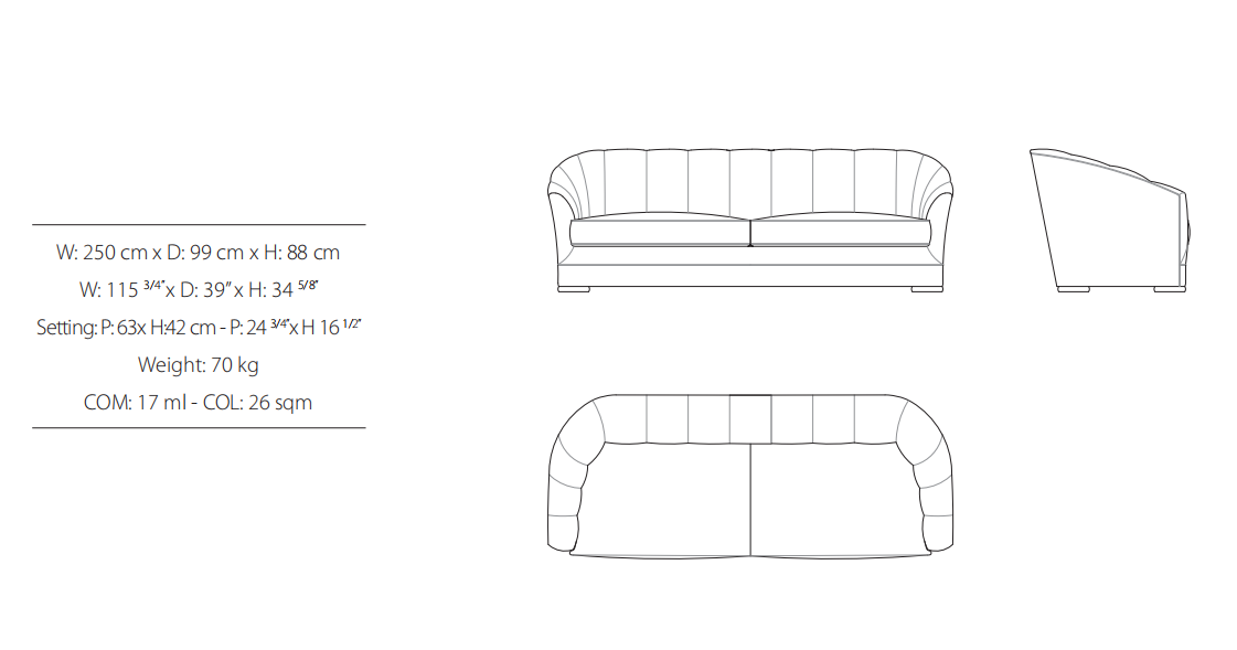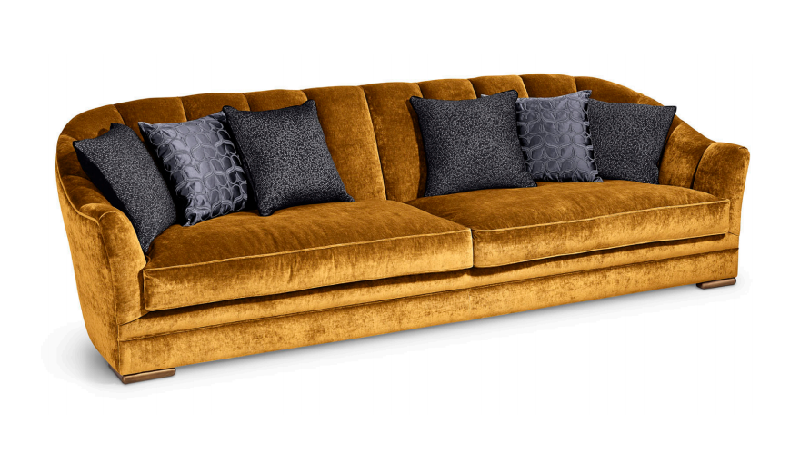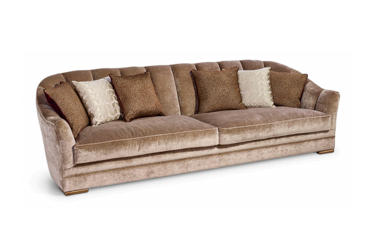 Sofa, frame made of solid timber and plywood. Variable densities polyurethane foam padding. Nr.1 pillow 50x50 cm and nr.1 pillow  50x35 cm in mixed feather. Skirting in antique bronze or antique finish distressed paint.