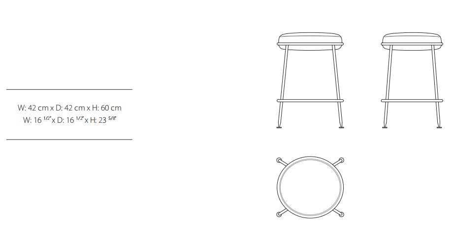 Stool frame made of solid timber and plywood. Variable densities polyurethane foam padding. Metal ring and feet in distressed finish.