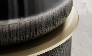 Tavolo appoggio in ceramica finitura antracite, dettaglio in legno verniciato oro opaco.