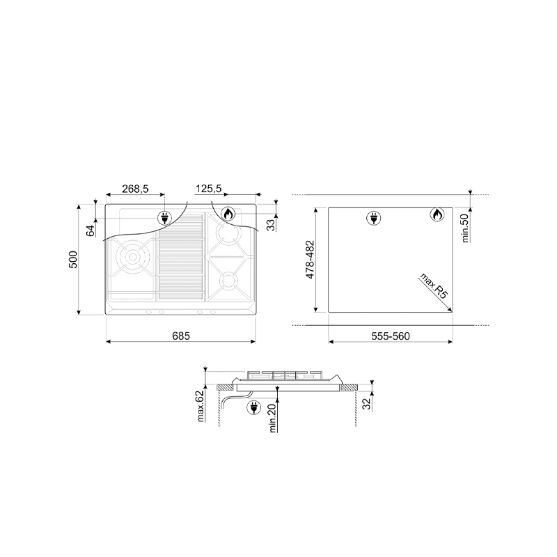 Classic/ 經(jīng)典系列,70cm 嵌入式 3 眼燃氣灶具,1 級能效,拉絲不銹鋼,鑄鐵鍋架,全銅爐頭組件