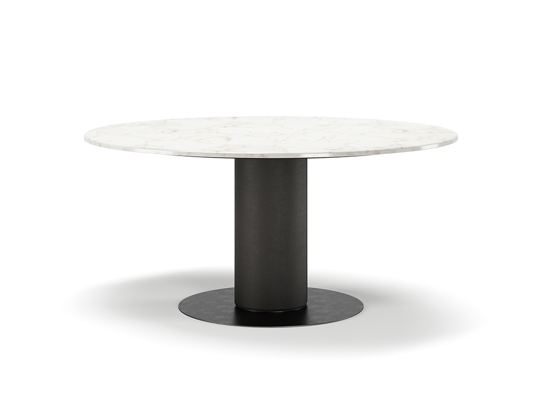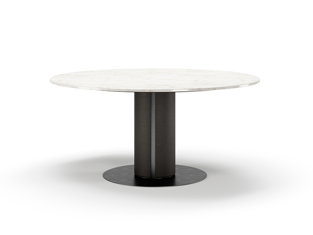 TAVOLO ROTONDO CON TOP IN MARMO, GAMBA E BASE IN METALLO SATINATO RIVESTITA IN PELLE