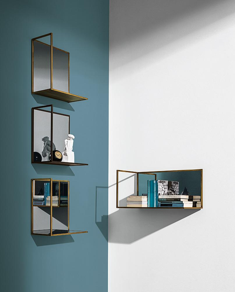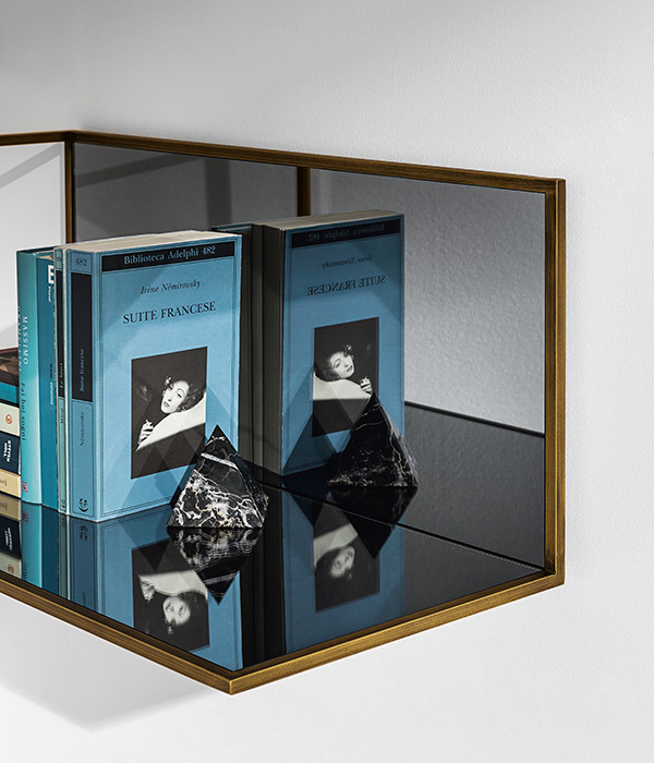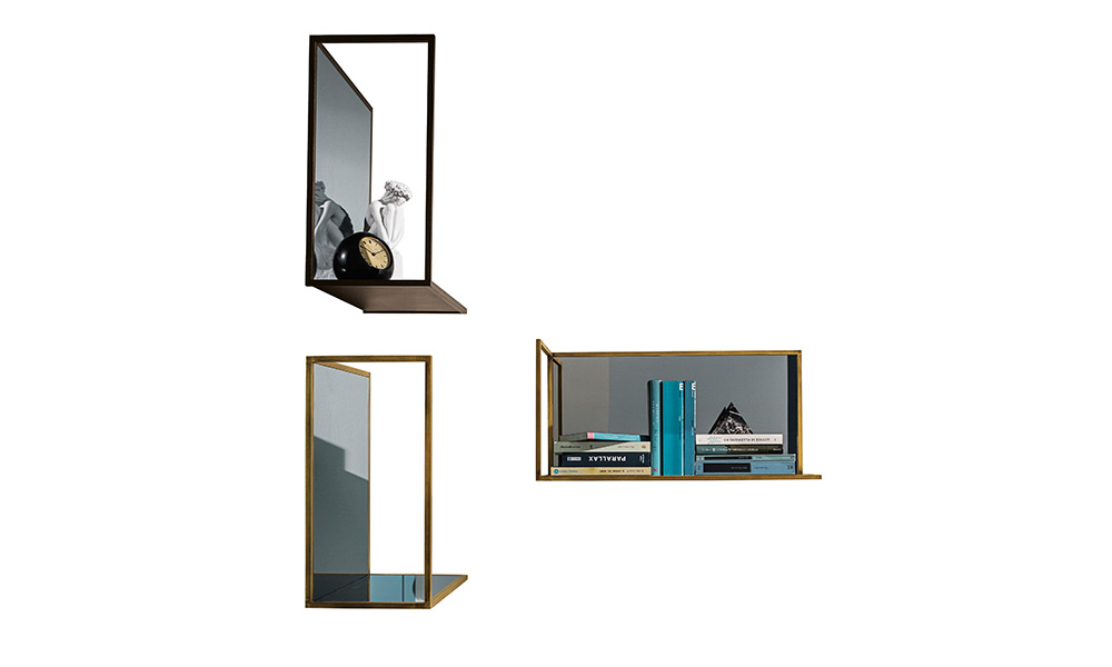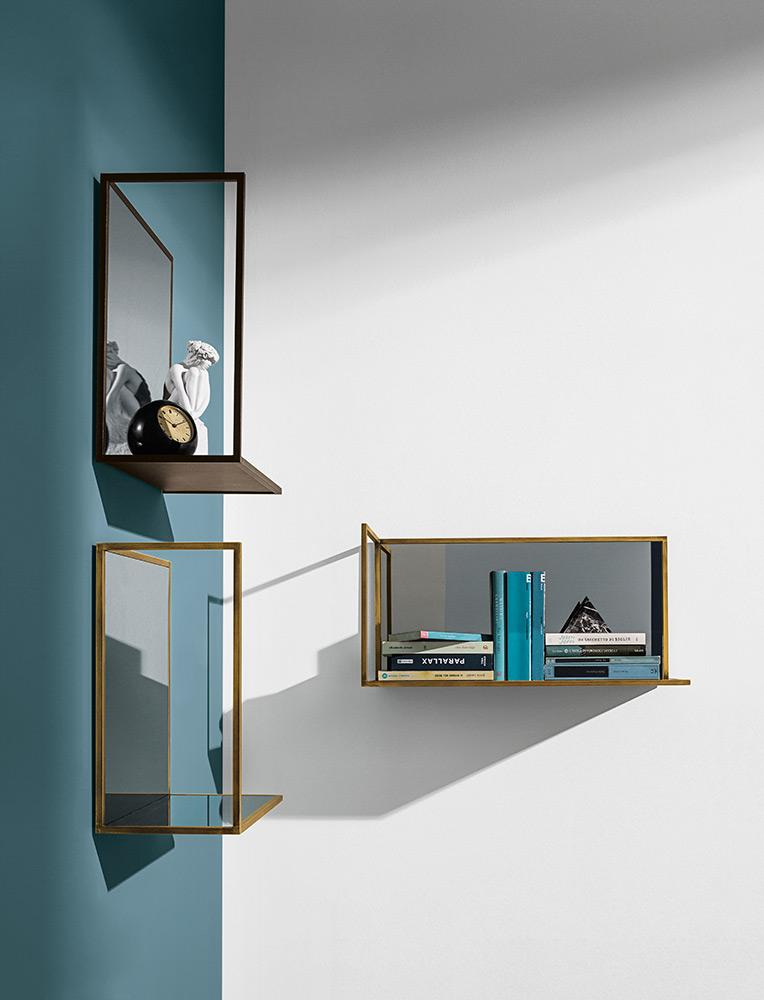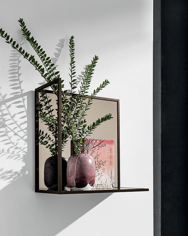 La struttura ricercata e minimale di Helia è impreziosita dalle mensole in specchio bronzo o fumé per donare un fascino esclusivo agli interni. Le due dimensioni e le diverse profondità permettono vari utilizzi e accostamenti.