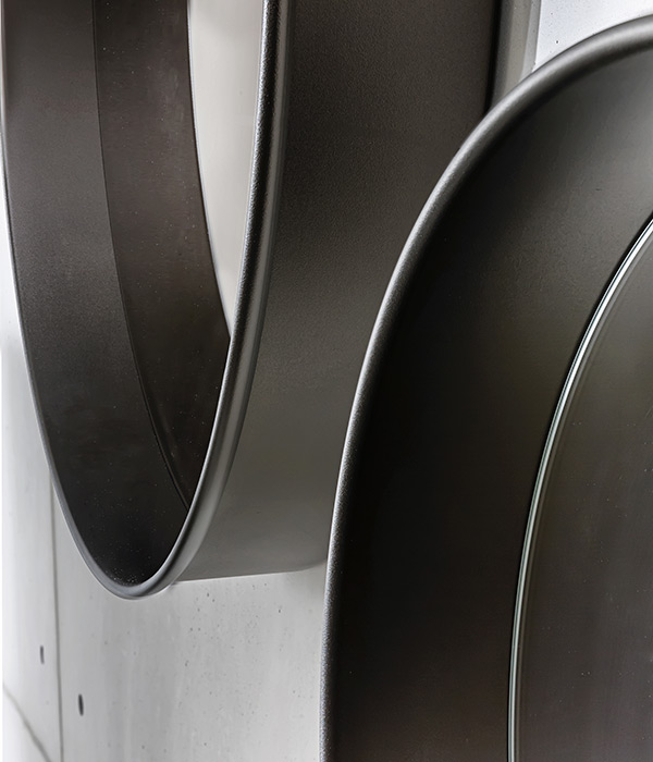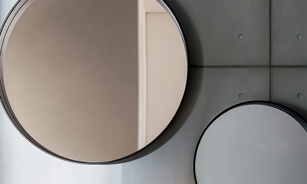 La superficie riflettente è disponibile con un’acidatura che disegna un orizzonte visivo, giocando con la luce e le proporzioni. Le diverse dimensioni disponibili e l’attacco a parete orientabile consentono di creare diverse situazioni e composizioni. La cornice è proposta in due profondità ed in quattro finiture laccate (caffè, creta, bianco e nero), abbinabili a specchi con finitura argento, fumè o bronzo. Una molteplicità che si presta a dare vita a svariate soluzioni, ampliando gli orizzonti d’arredo dello spazio domestico o collettivo