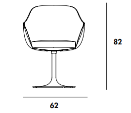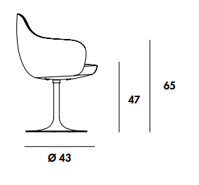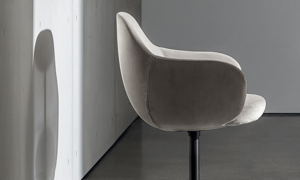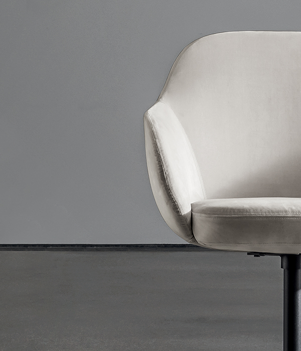 Sedia/poltroncina con base girevole in metallo laccato, varie finiture. Scocca rivestita in vari materiali e finiture.