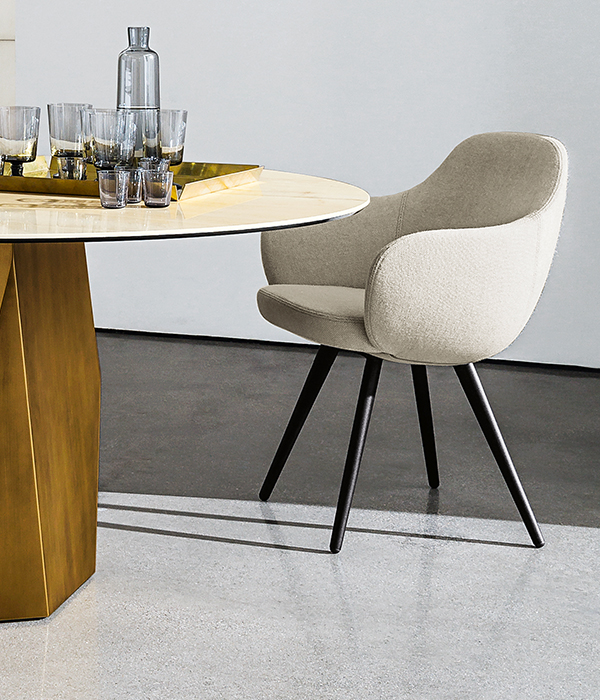 Una seduta dalla forma comoda ed avvolgente che accompagna con raffinatezza e semplicità i tavoli della collezione Sovet. Le finiture di Cadira, dalla pelle all’ecopelle fino al tessuto Kvadrat e le diverse tipologie di strutture personalizzano e completano la seduta per gli interni pubblici e privati.
