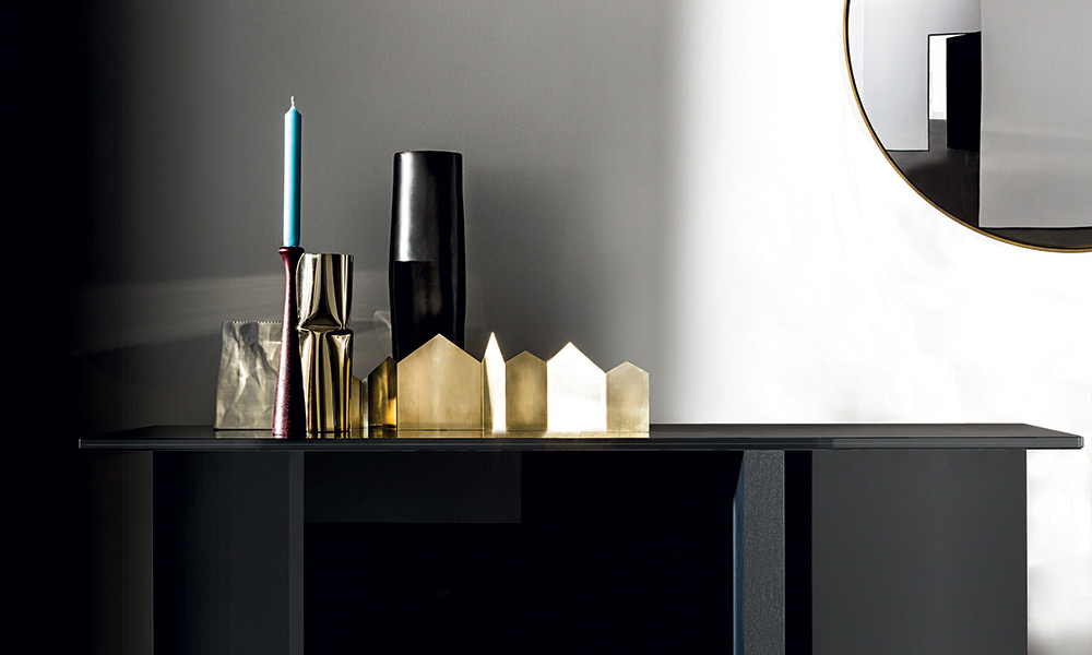 Consolle con top in vetro stratificato fumé. Base composta da un elemento in legno disponibile in varie finiture e un elemento in vetro laccato nero.