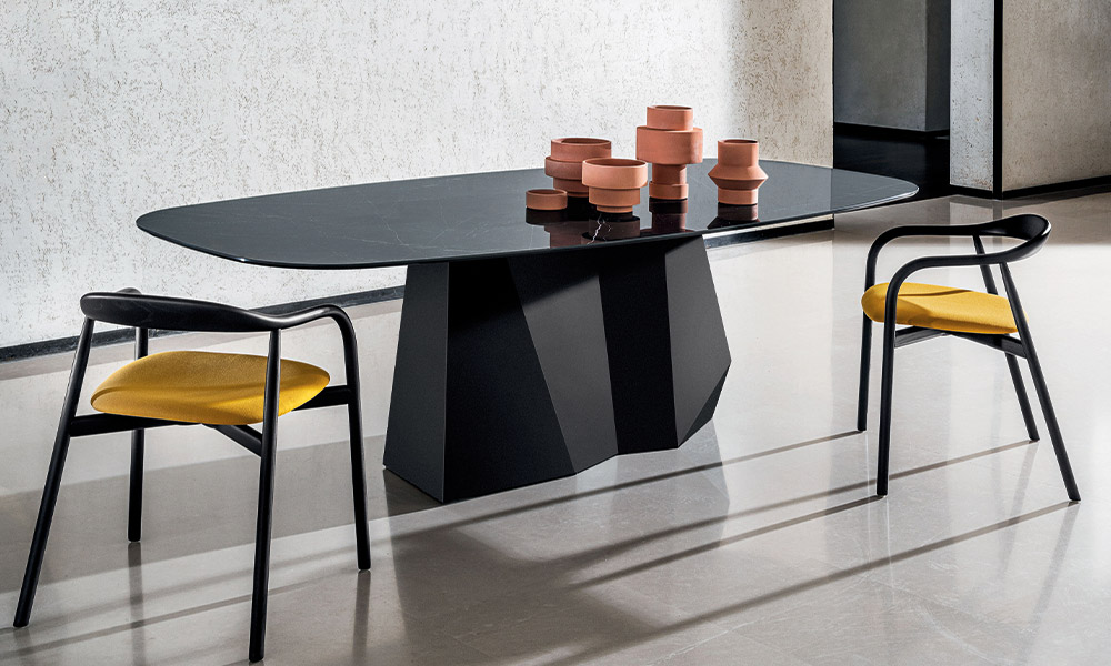 Tavolo con base in metallo verniciato, disponibile in varie finiture. Top temperato o stratificato in varie misure, materiali e finiture