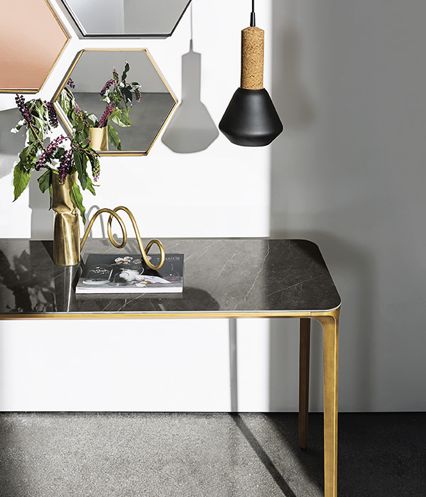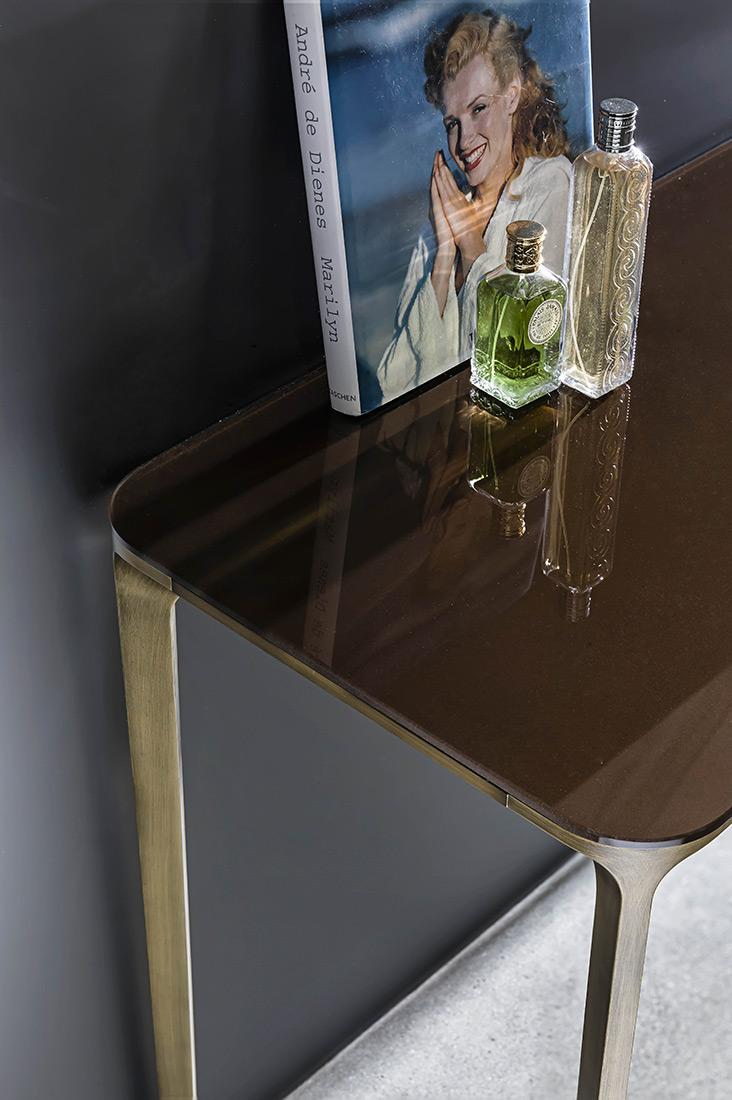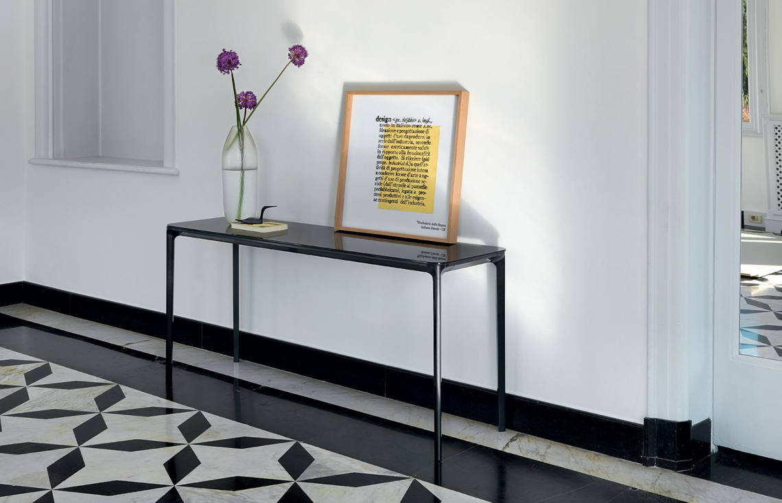 Consolle con gambe in alluminio pressofuso cromato o verniciato, varie finiture, e struttura con profilo in alluminio anodizzato o verniciato, varie finiture. Piano in vetro temperato sp. 8 mm laccato o acidato laccato, vari colori. Disponibile anche nelle versioni con top in Materia o ceramica, varie finiture. Il top in legno è disponibile nella versione a quattro gambe.