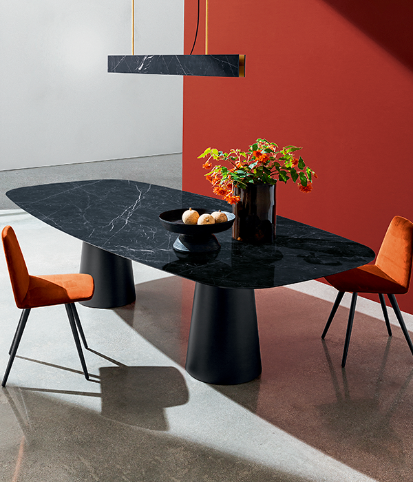 Tavolo con basi in metallo laccato, varie finiture. Top temperato o stratificato in vari materiali e finiture. Su richiesta, con specifiche finiture, è possibile la personalizzazione per uso OUTDOOR.