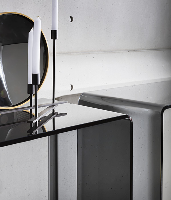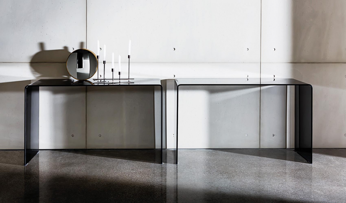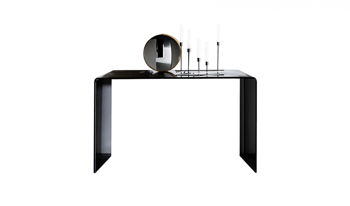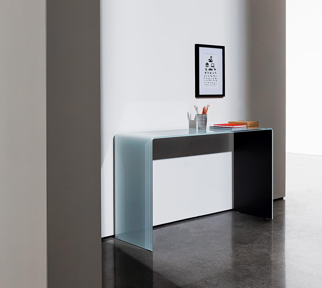 Consolle in vetro curvato trasparente extrachiaro, fumé, laccato, mono o bicolore. Disponibile anche con ripiano in vetro.