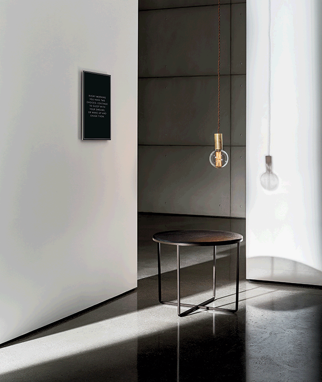 Tavolino rotondo con struttura in metallo laccato nelle finiture ottone brunito o caffé. Top disponibile in vetro laccato o vetro materico specchiato nelle finiture bronzo o perlato.