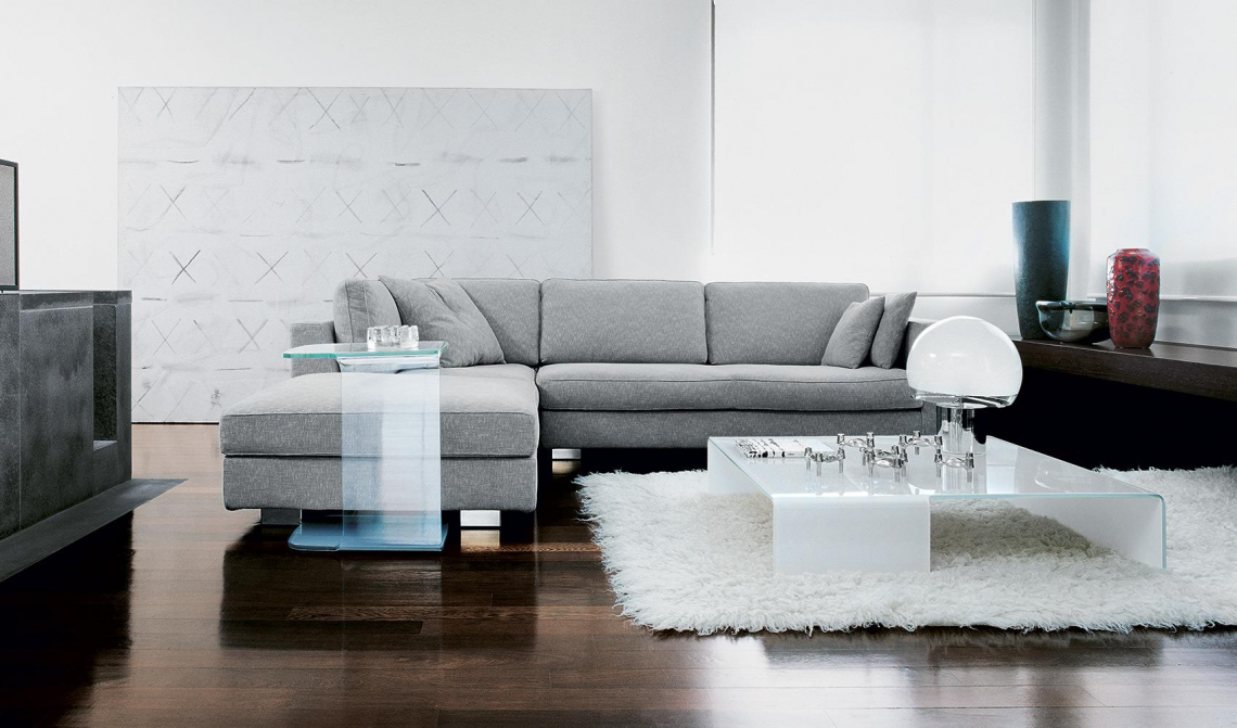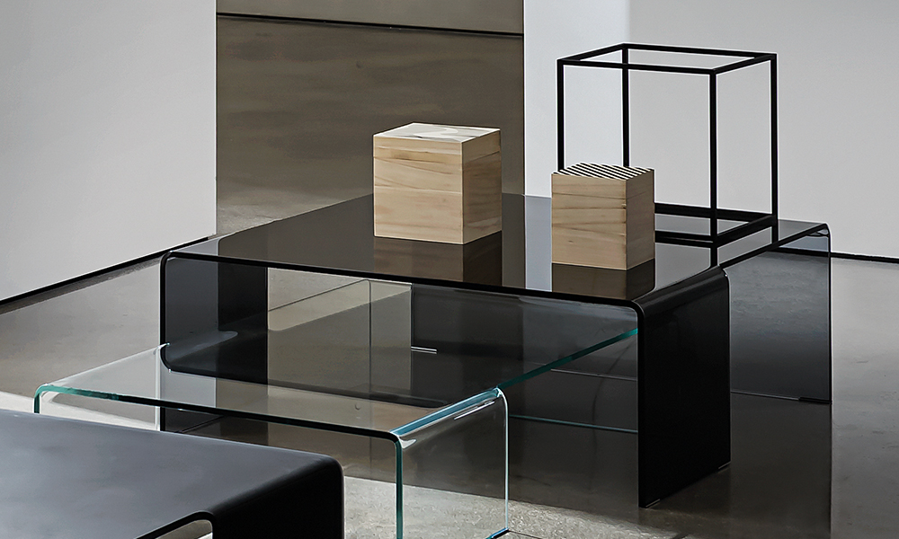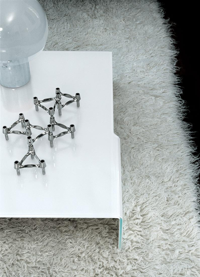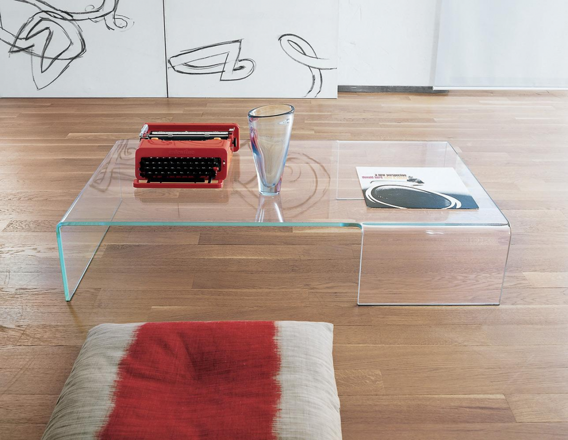 Tavolino in vetro curvo trasparente extrachiaro, fumé o laccato mono o bicolore.