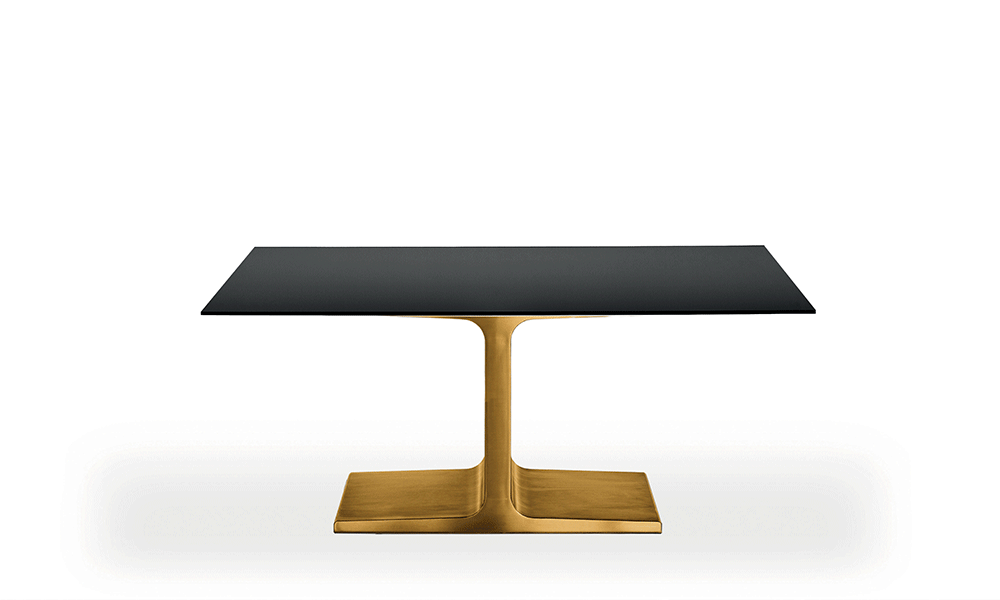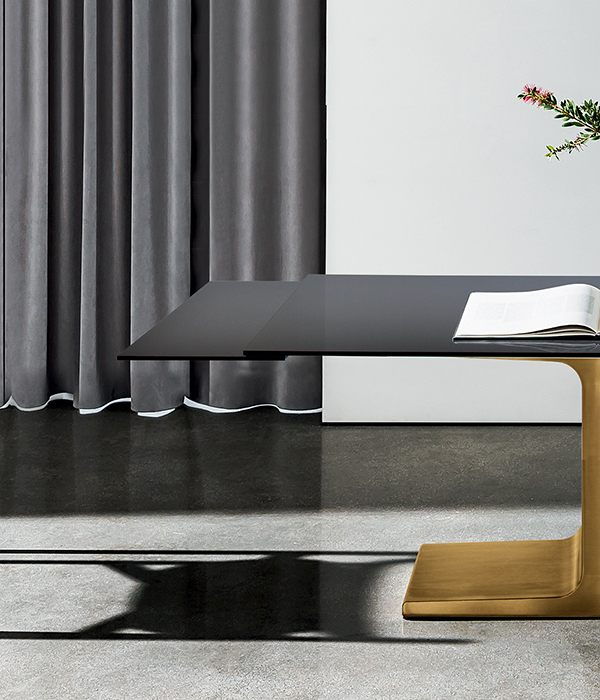 Tavolo allungabile con base in metallo laccato, varie finiture, o brunito. Top temperato o stratificato in varie misure, materiali e finiture. Struttura allungabile con finitura alluminio.