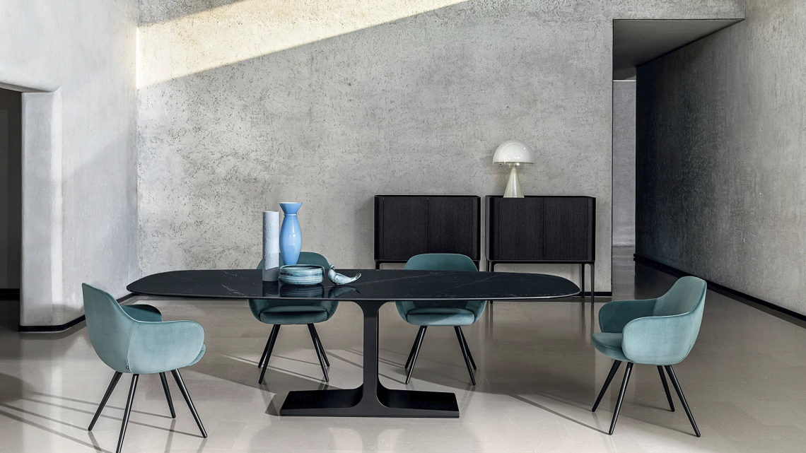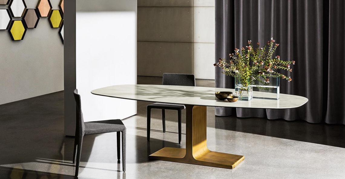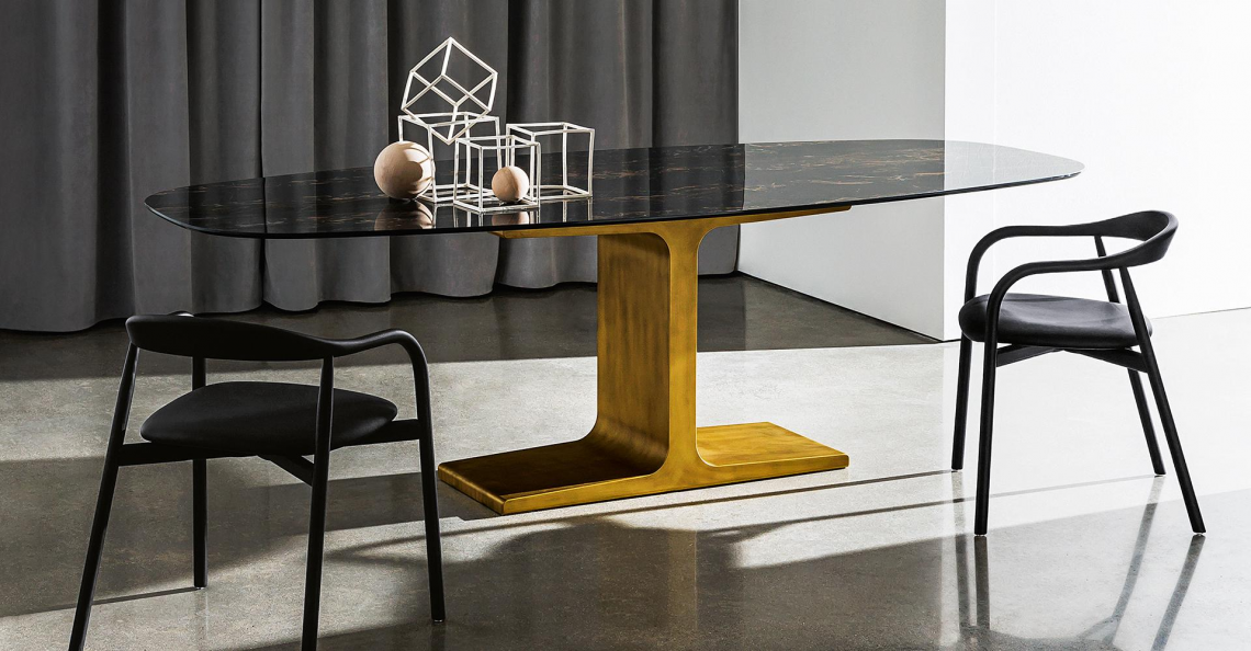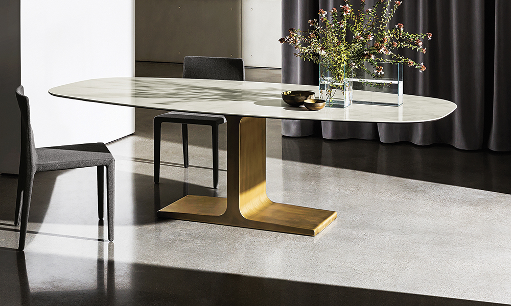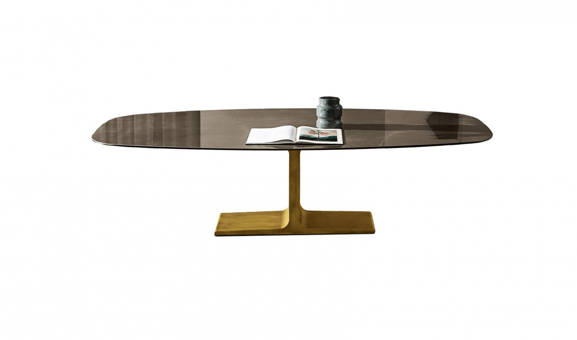 Tavolo con base in inox satinato, metallo laccato varie finiture o brunito. Top in vetro temperato laccato, legno o ceramica, varie finiture