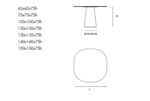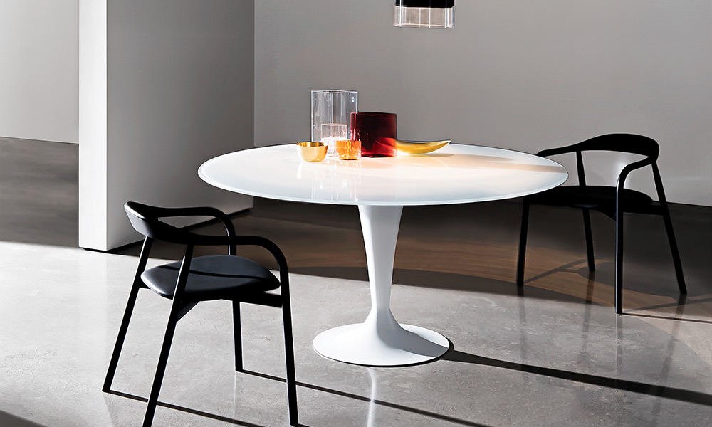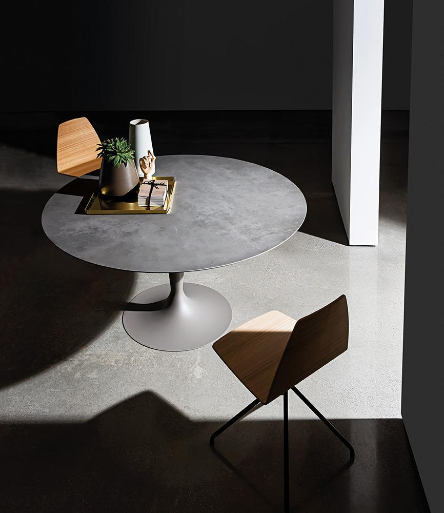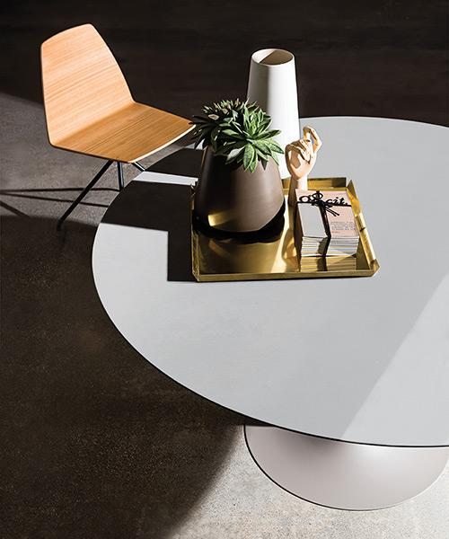 Tavolo con base in metallo cromato o laccato, varie finiture. Top in vetro temperato, MATERIA o ceramica, varie finiture.
