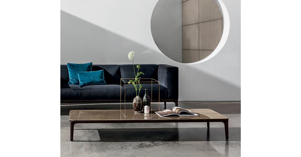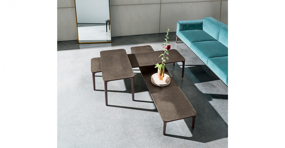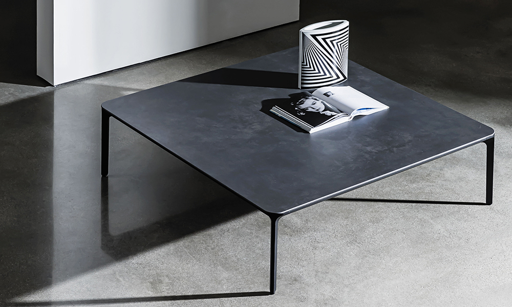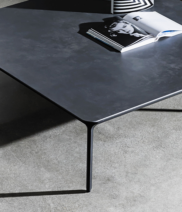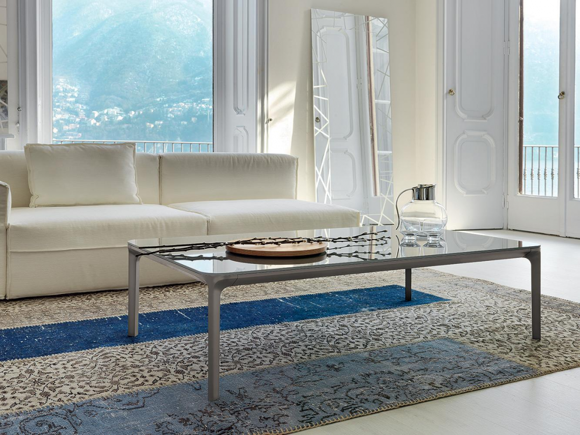 Tavolino con gambe e struttura in alluminio, varie finiture. Top disponibile in varie misure, forme, materiali e finiture.