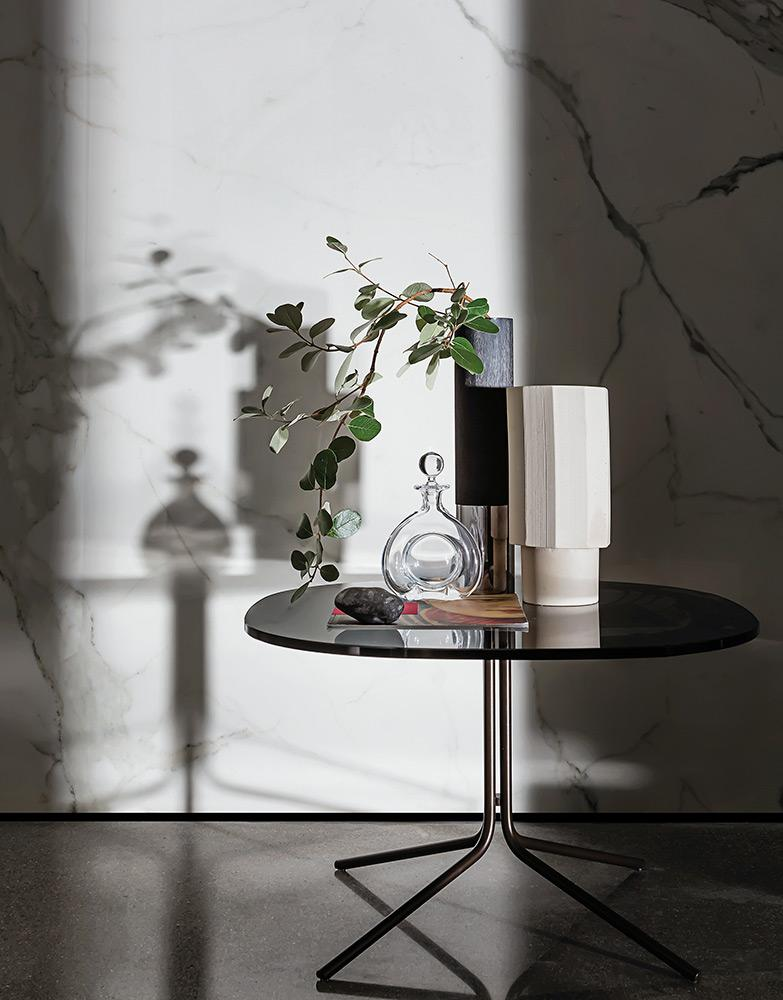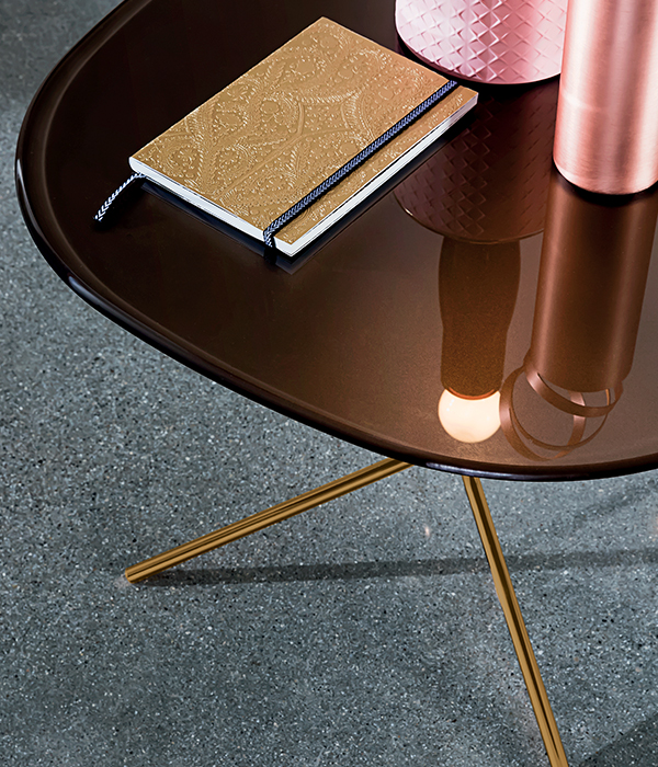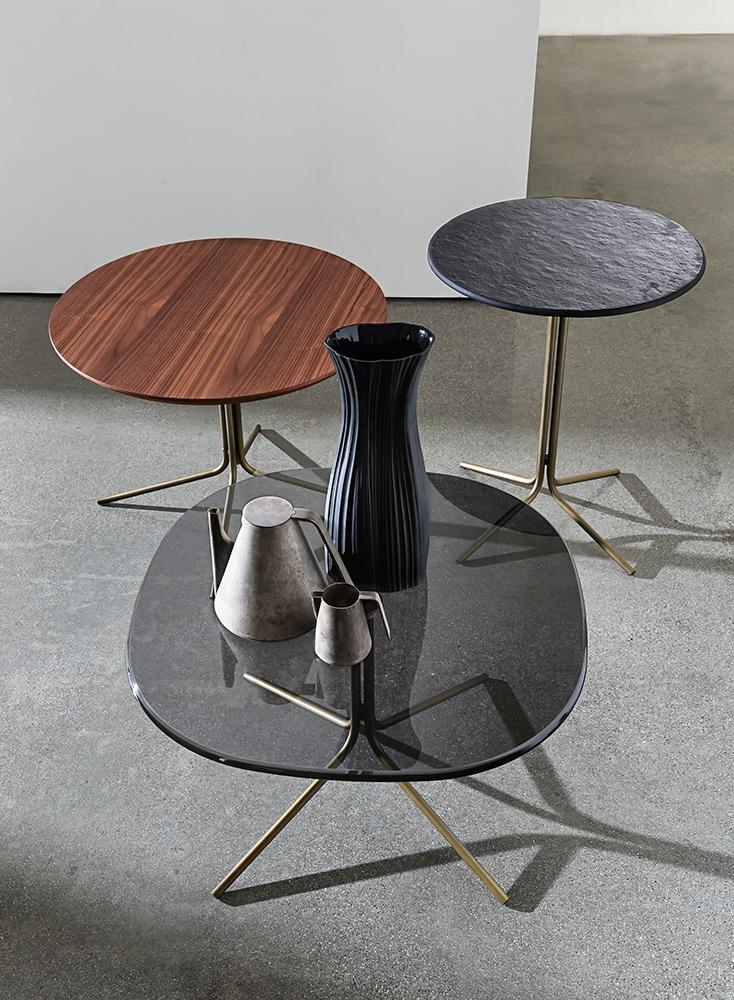 Tavolino con base in metallo, varie finiture. Top temperato o stratificato in varie misure, materiali e finiture.