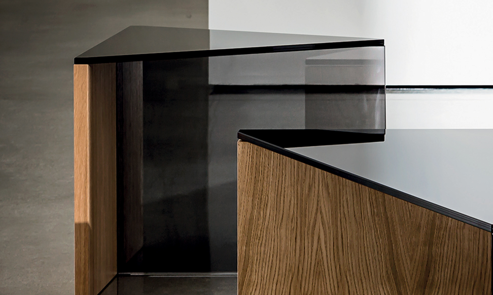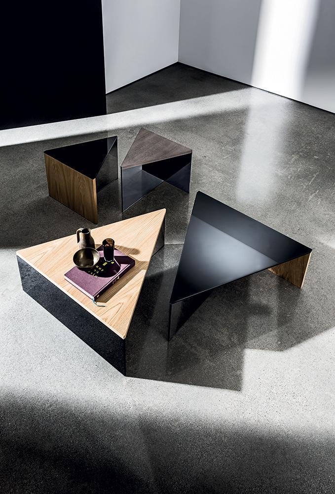 Tavolino moderno triangolare disponibile con top in vetro stratificato nero oppure top in legno, varie finiture. Nella versione top in vetro la base è composta da un elemento in vetro fumé e da un elemento in legno. Nella versione top in legno la base è composta da un elemento in vetro fumé e un elemento in vetro stratificato nero.
