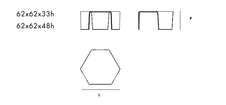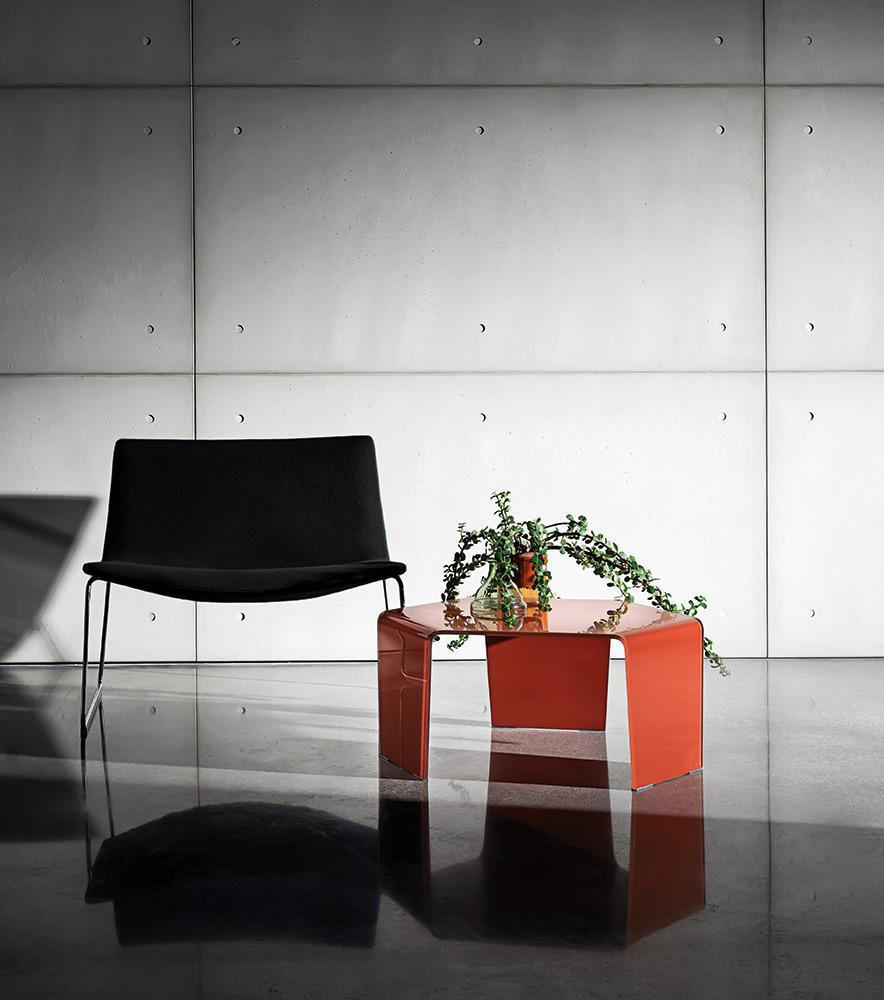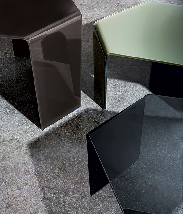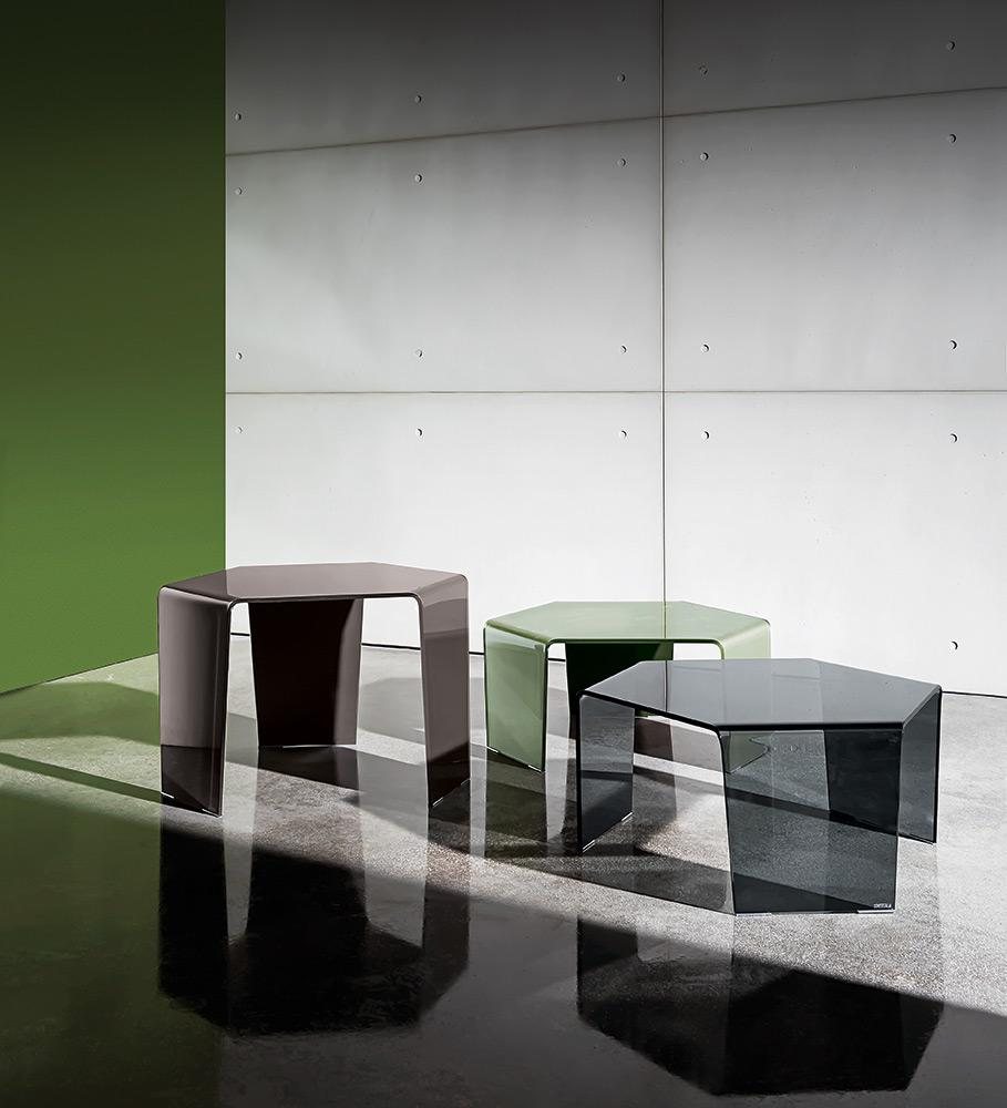 Tavolino esagonale disponibile nella versione trasparente extrachiaro, fumé o laccato mono e bicolore.