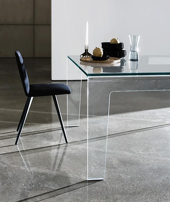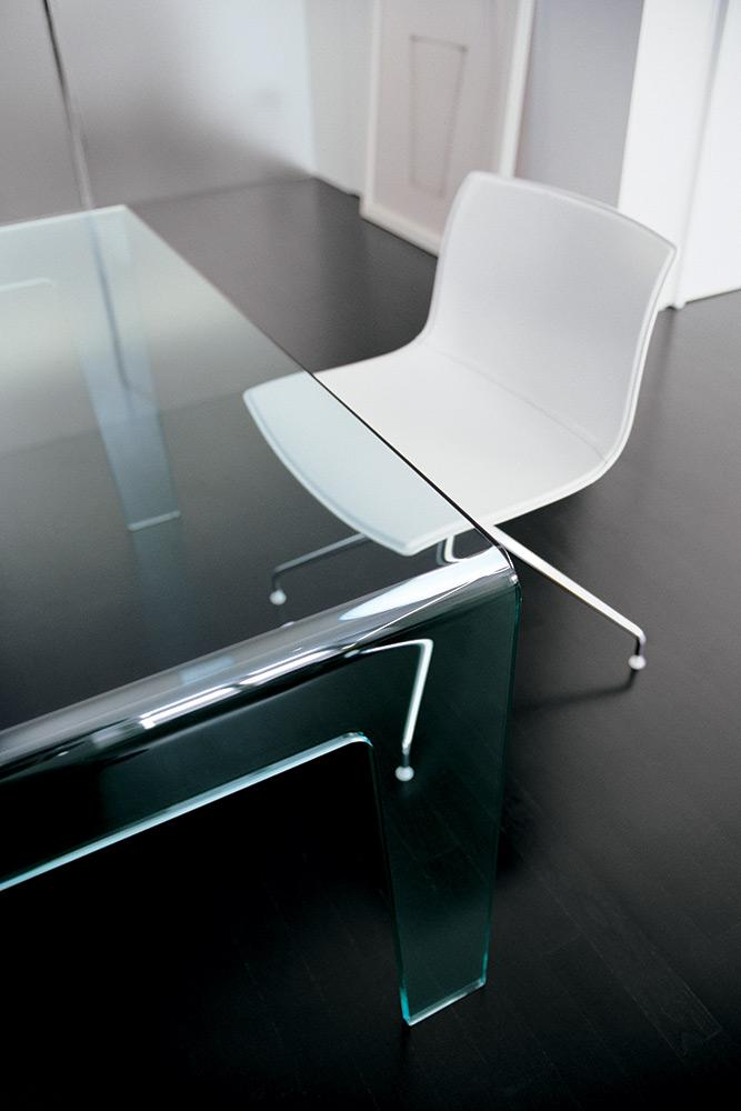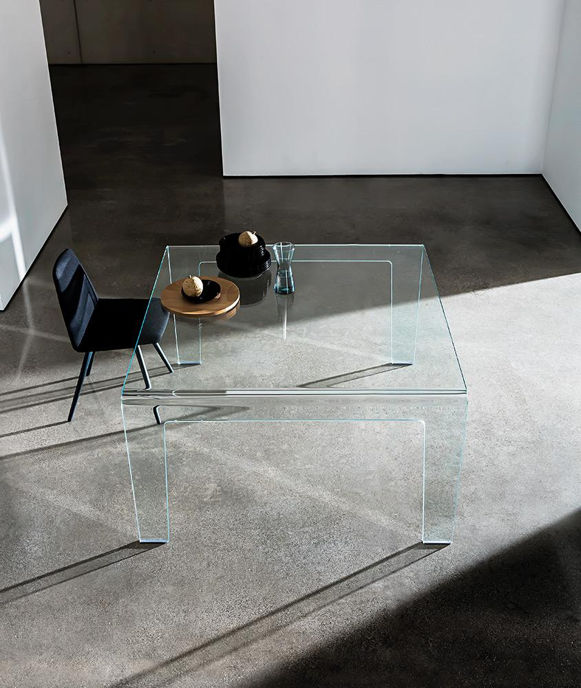 Tavolo in vetro curvo trasparente extrachiaro o laccato mono o bicolore, vari colori.